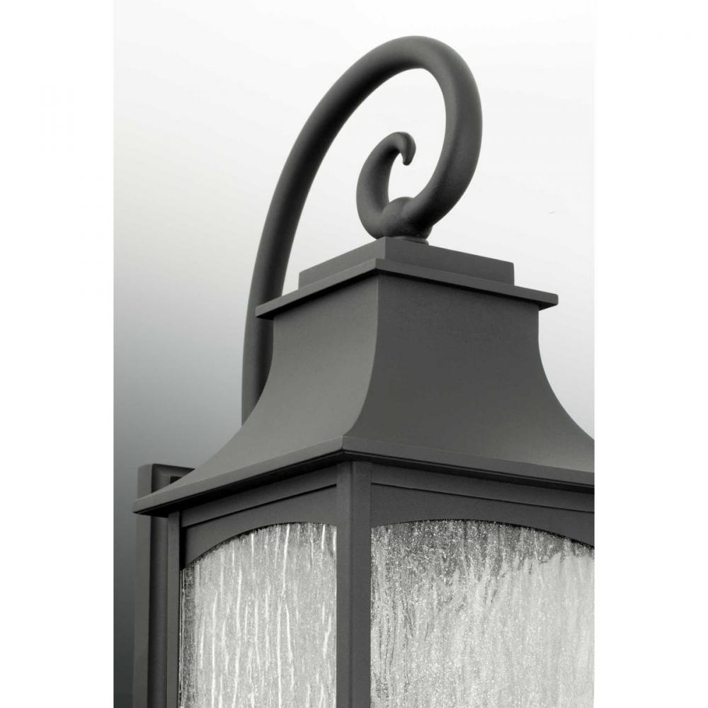 Three-light large wall lantern in the Maison Collection offers traditional French country styling for a variety of home settings. Classic and formal clear water seeded glass complements the powder coat finish. Black finish.