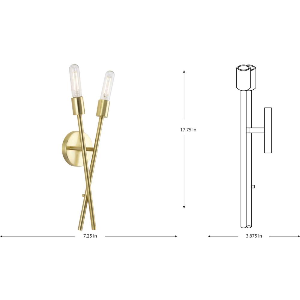 The Astra wall bracket features a space-age-inspired design perfect for modern and mid-century décor. A pair of elongated arms are held by a round backplate, bringing a dynamic flair to the fixture's design. A lovely satin brass finish adds a touch of soft glamour. Decorative bulbs (sold separately) adorn the ends of each perpendicular arm. This versatile wall bracket is ideal for bringing illumination to dining rooms, kitchens and bedrooms. This fixture is part of the Progress Lighting Design Series, a lighting collection offering fashionable styles and affordable luxury lighting for the home.