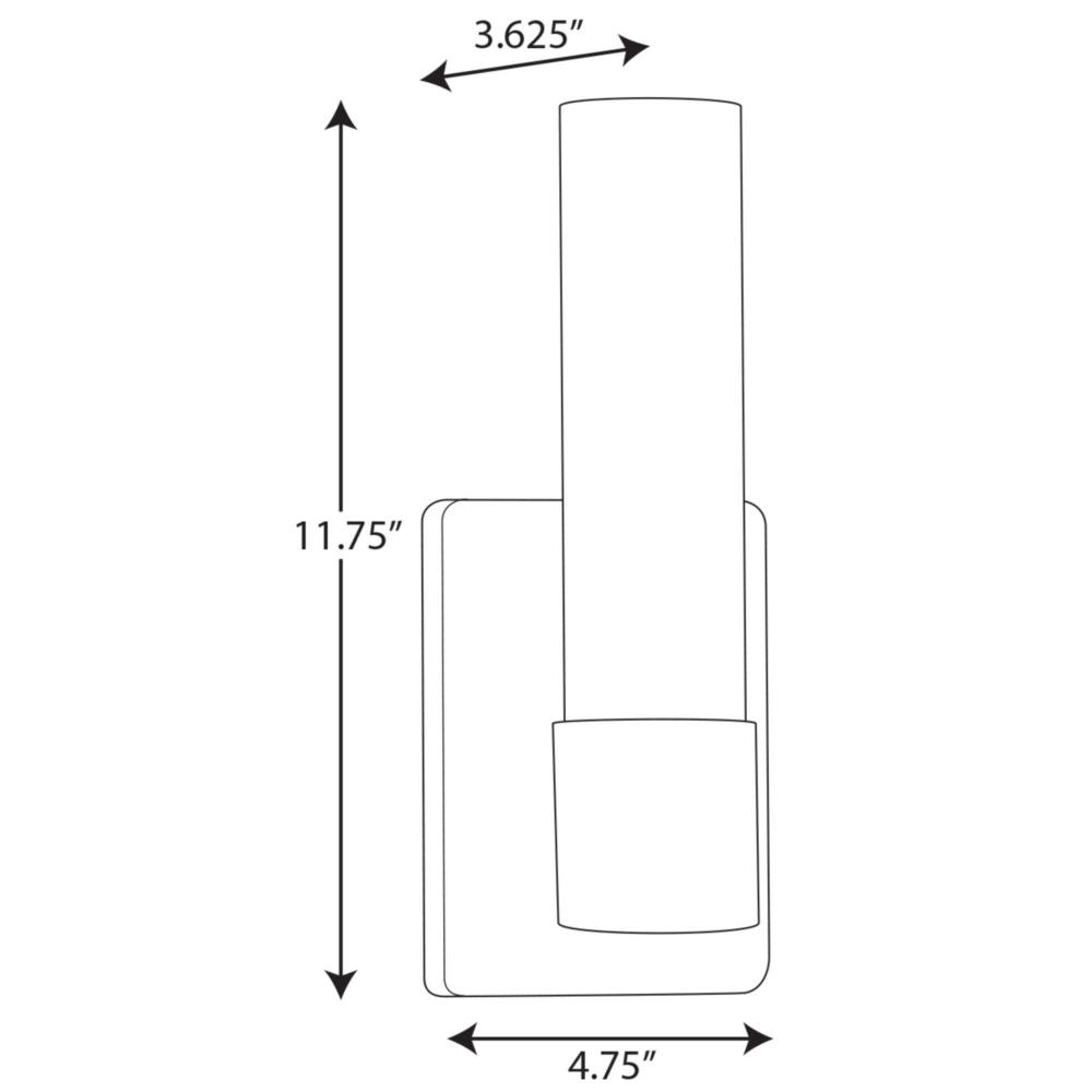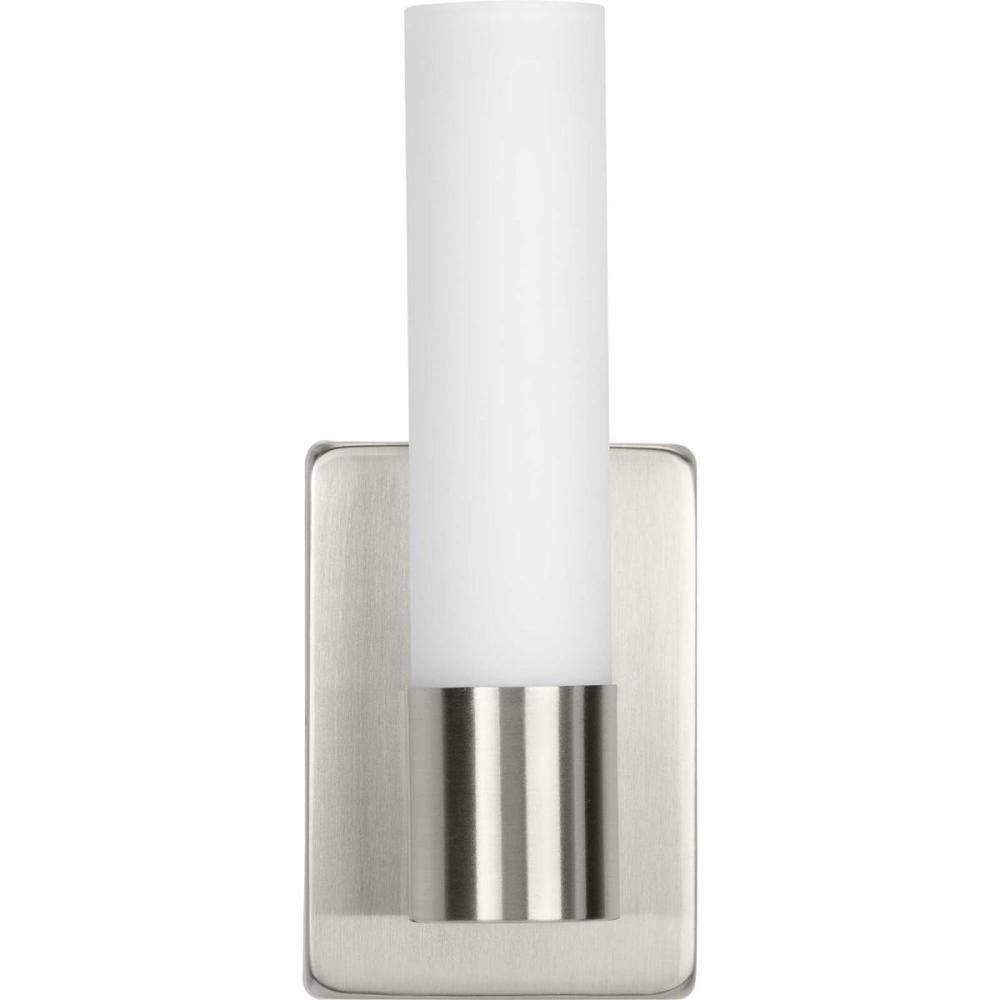 This LED wall bracket highlights classic forms with crisp, contemporary updates.;An understated brushed nickel backplate holds a smooth, modern light base.;Within the light base stands a cylindrical etched glass shade that evokes images of candlesticks.;Id