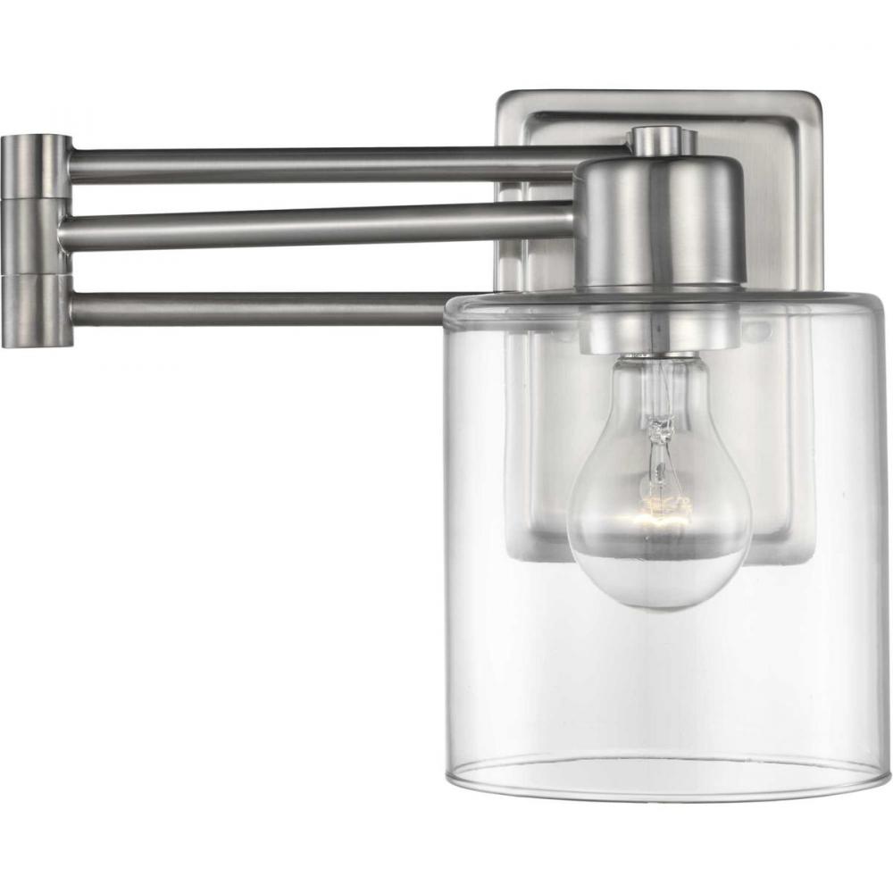 Experience the comforting familiarity of the classic components of this wall bracket. Snuggle up in bed with a good book and warm cup of tea as the light fixture's brushed nickel swing arm provides you with the lighting flexibility you need to fit your lifestyle. A crisp, clear glass shade contrasts with the industrial backplate.