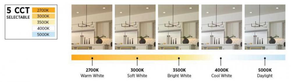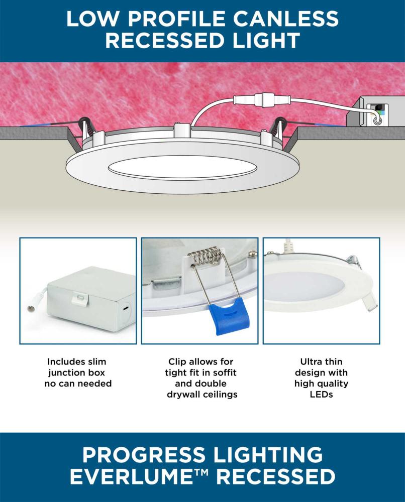 Innovative, 5-CCT selectable LED technology and a slim profile make the 6-inch Everlume Recessed Downlight an ideal downlight for new construction and remodel projects. Smooth, even edge-lit illumination in a choice of 2700K, 3000K, 23500K, 4000K or 5000K color temperature settings is delivered through a polycarbonate lens. The 12W, 925 integrated LED light source is dimmable using ELV or TRIAC dimmers. Its aluminum trim is finished in crisp Satin White that blends quietly into its surroundings. A detached J-Box, provided with quick connects, eliminates the need for an additional recessed housing. The trim features a gasket to close off the ceiling opening. Additionally, spring clips ensure a secure flush mount to the ceiling surface. Everlume recessed LED is easily installed into 6-inch openings in low clearance, new construction and remodel, ceiling applications. This versatile downlight is JA8-2019 Title 24 Rated, and cETLus Wet Listed for use in areas where water may be present.