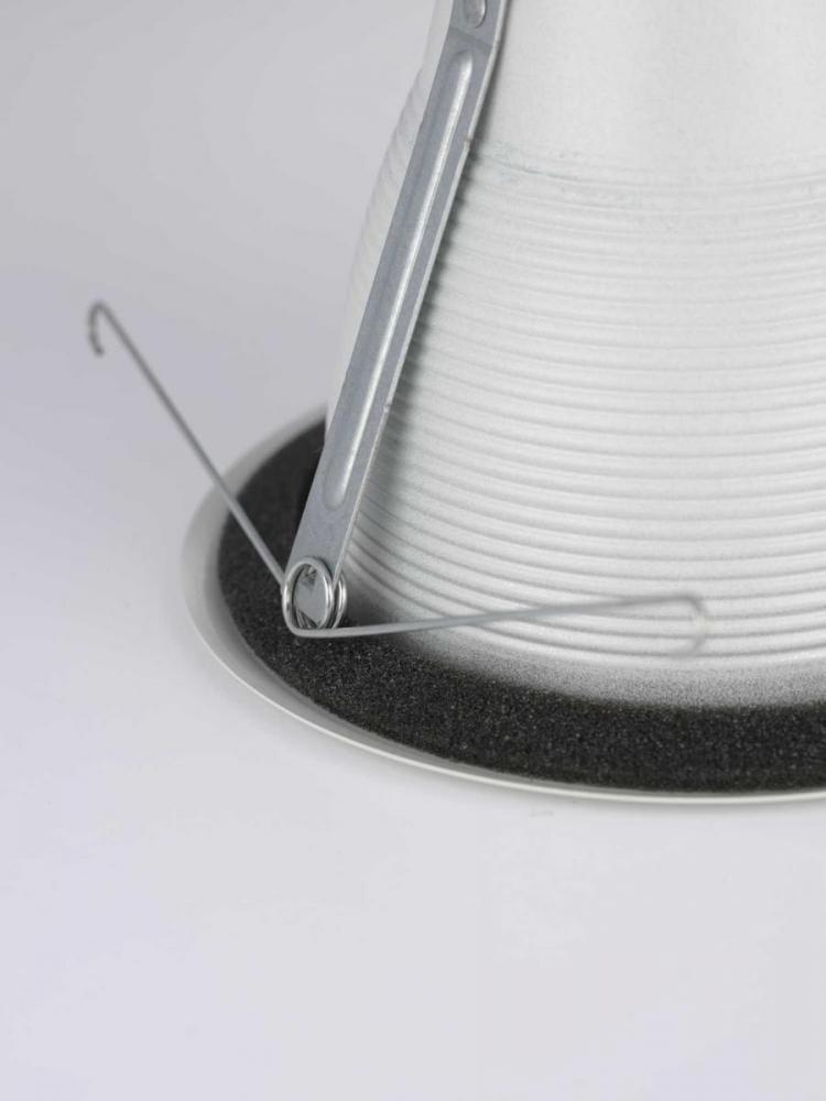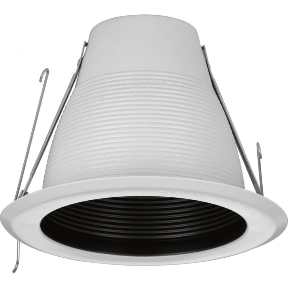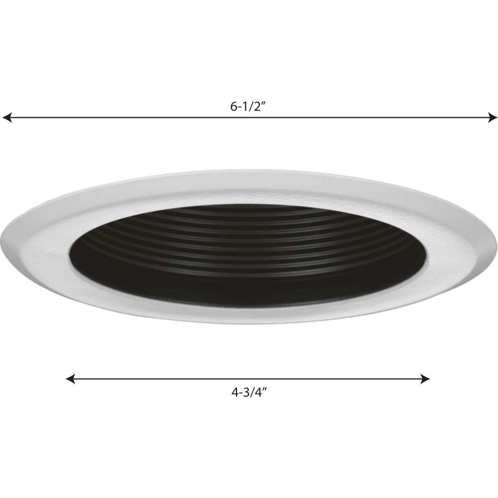 5" Step Baffle Trim in a Black finish and bright white powdered painted metal flange. UL and CUL listed for damp locations. The trim uses friction springs to attach to the housing to provide a flush fit against the ceiling. Compatible for use in Progress P851-ICAT.