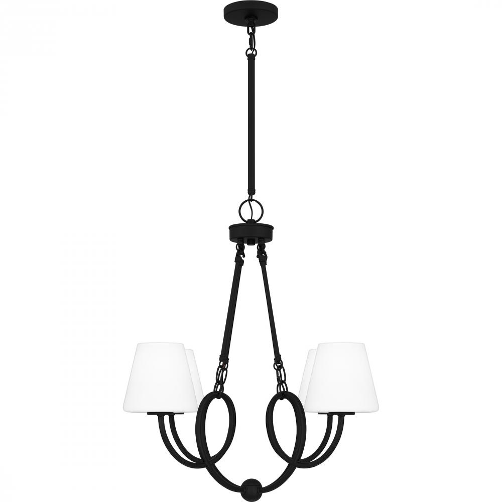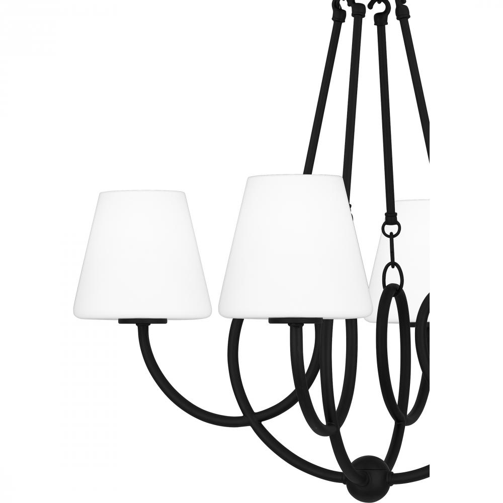 Matte black and opal etched glass make a perfect modern pairing in the Atkins collection. This trendy lighting collection elevates a classic silhouette with its unique, curving lines. Choose from a linear chandelier or classic shaded chandelier to add easy