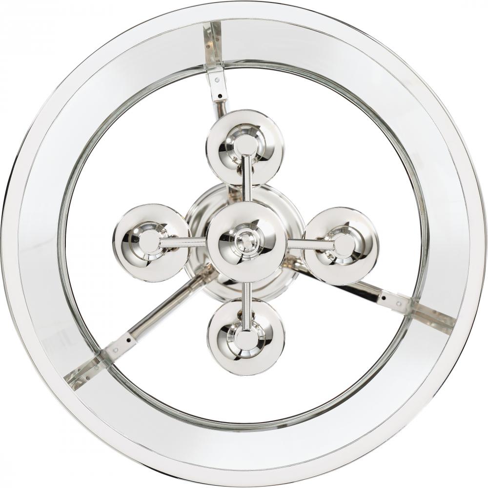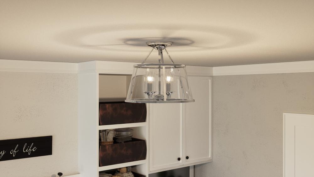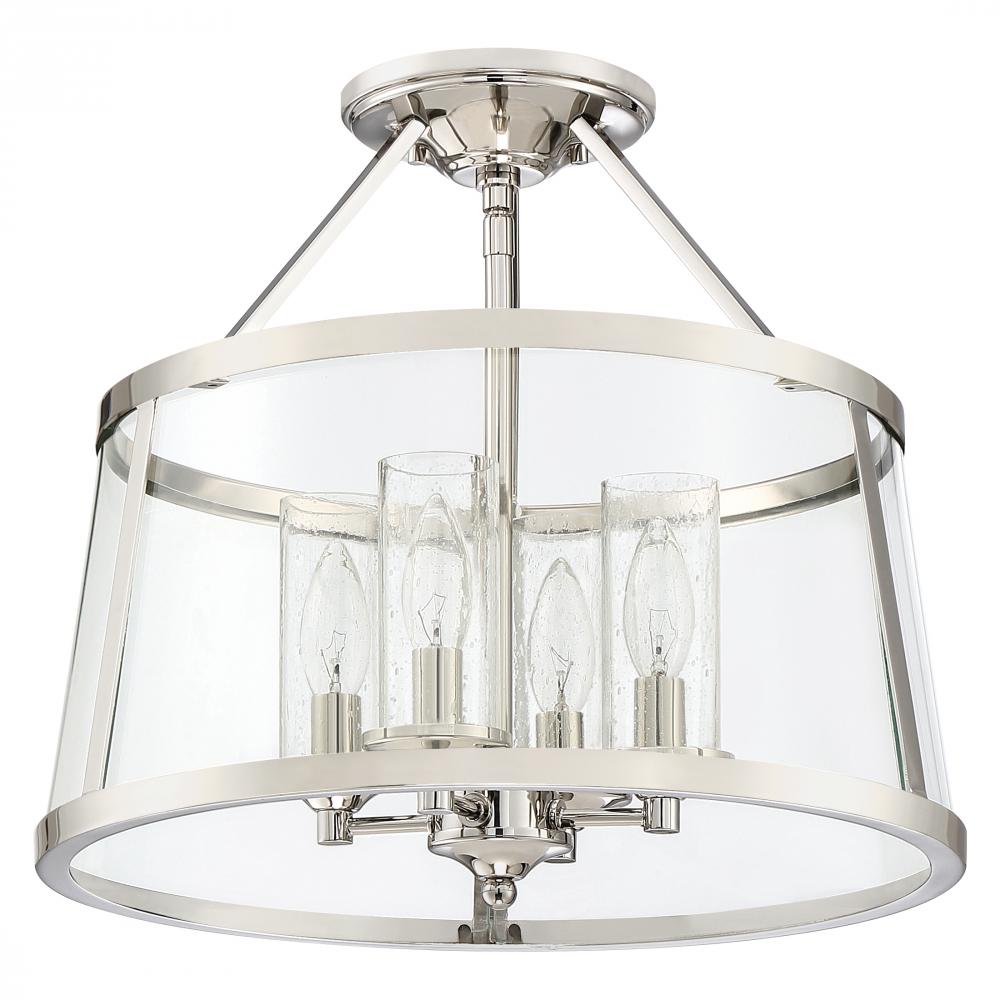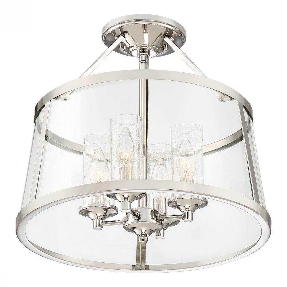 The Barlows transitional design adds simple sophistication to any space. The gleaming polished nickel frame highlights the beautiful drum silhouette of the outer shade, which features clear bent glass panels. Within the drum, seedy glass surrounds each ind