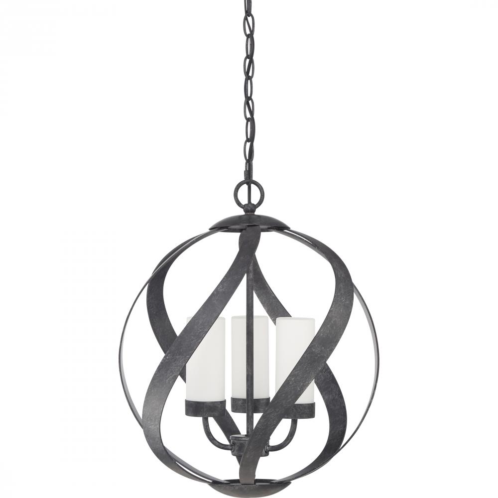 A spiral sensation, the Blacksmiths bold ironwork moves in soft curves along an orb-shaped silhouette. The old black finish includes accents of charcoal and dark silver for a sultry, smoke-like effect. The candles are fitted with cylindrical shades in fros