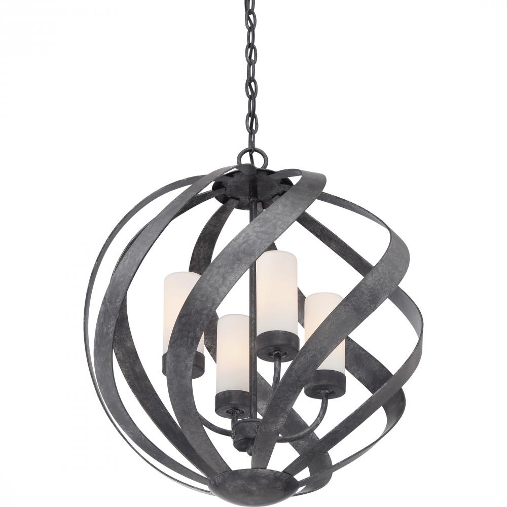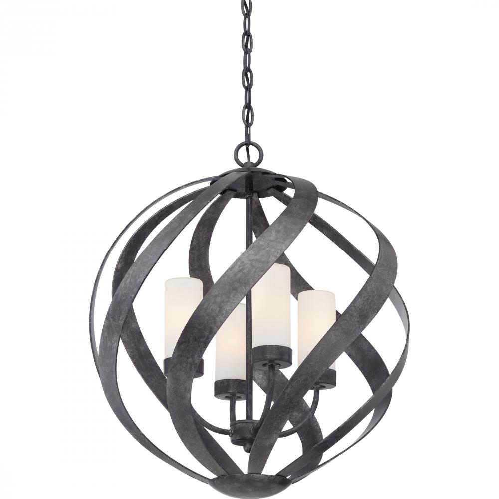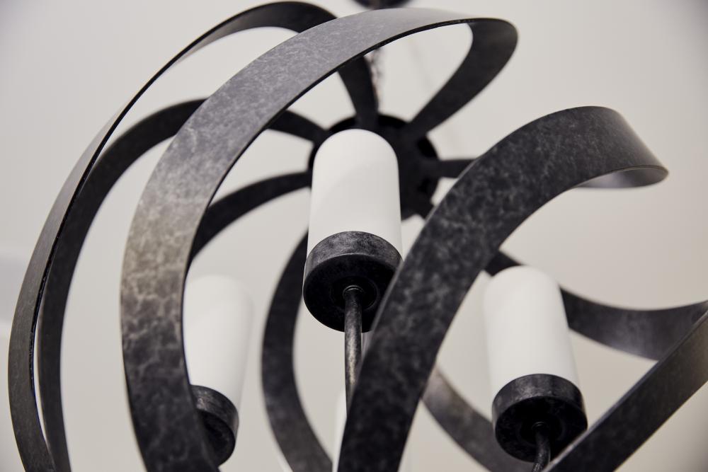 A spiral sensation, the Blacksmiths bold ironwork moves in soft curves along an orb-shaped silhouette. The old black finish includes accents of charcoal and dark silver for a sultry, smoke-like effect. The candles are fitted with cylindrical shades in fros