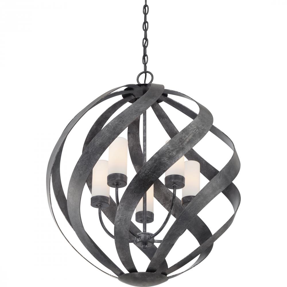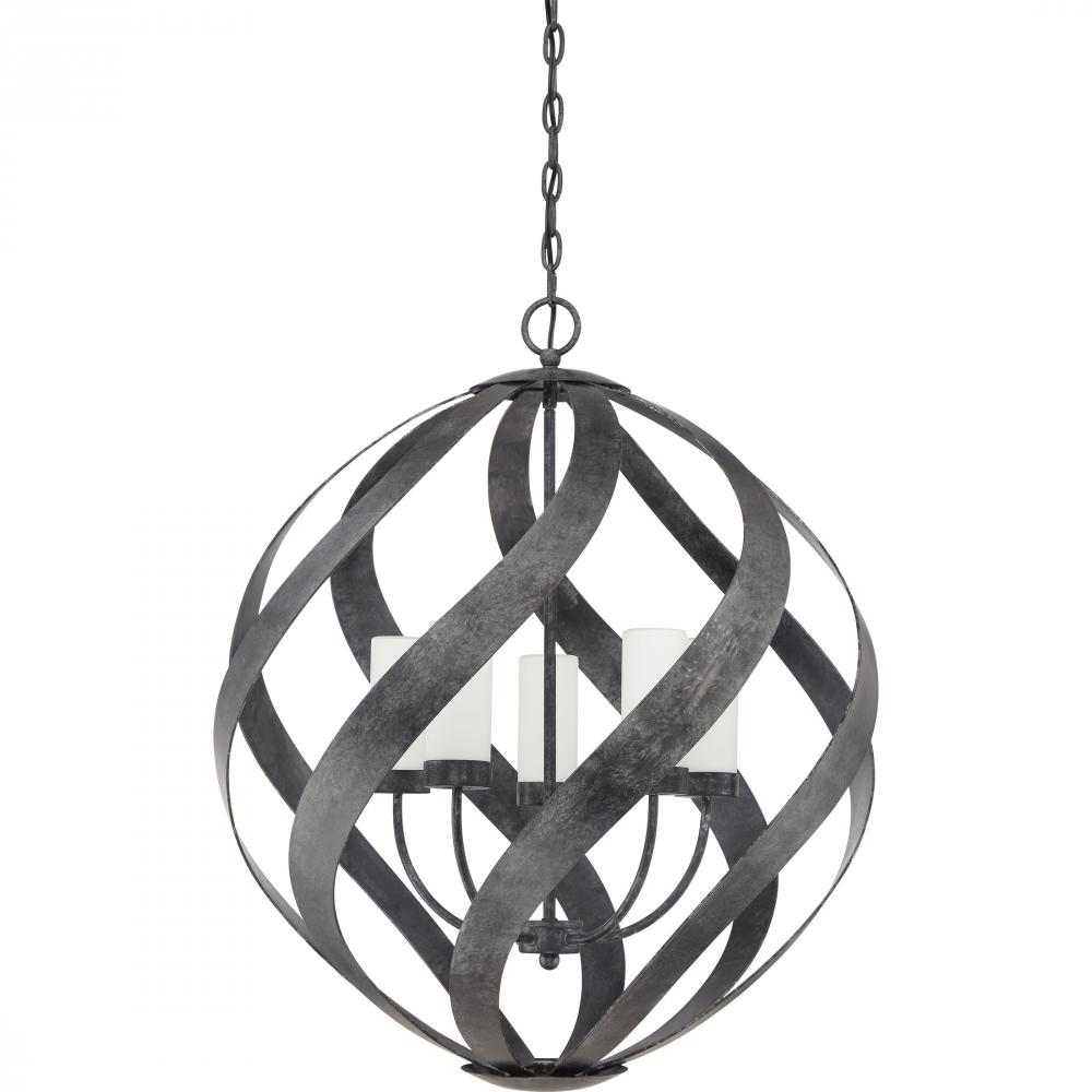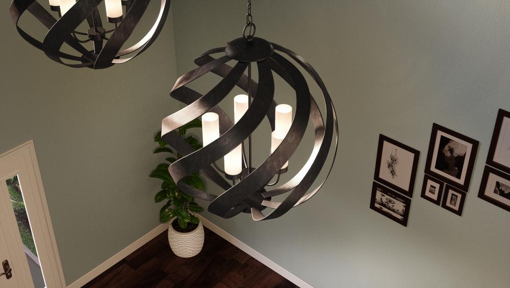 A spiral sensation, the Blacksmiths bold ironwork moves in soft curves along an orb-shaped silhouette. The old black finish includes accents of charcoal and dark silver for a sultry, smoke-like effect. The candles are fitted with cylindrical shades in fros