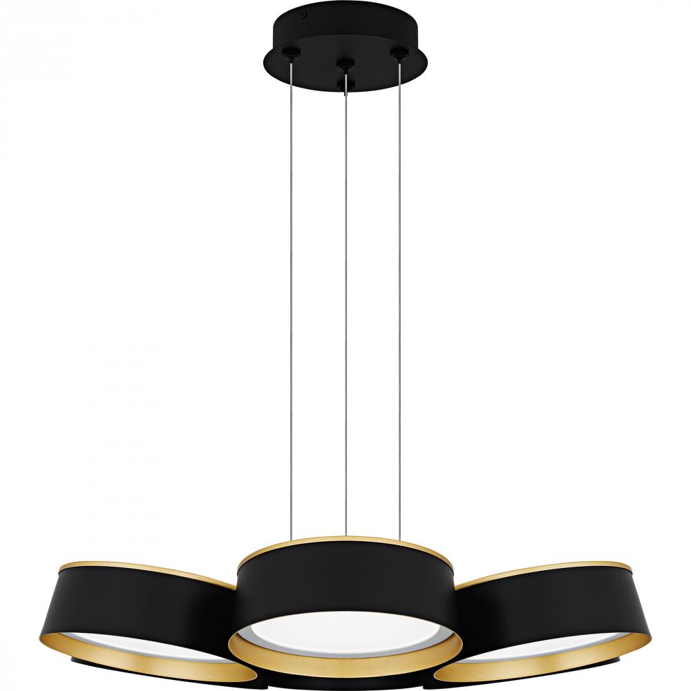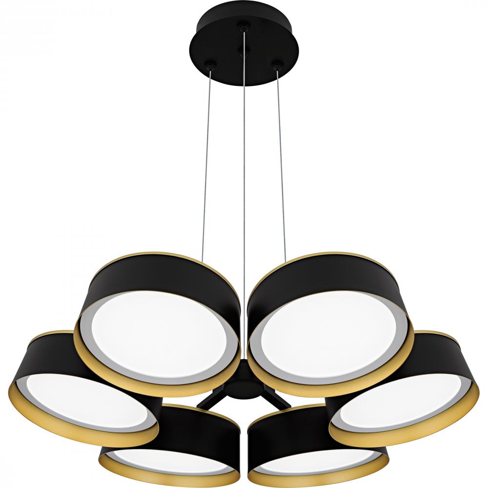Elevate your space with Byrnes, where modern design meets luxury. The striking combination of matte black and gold creates a sophisticated look in this unique fixture. Featuring a cluster of round metal shades, each equipped with an integrated LED light so