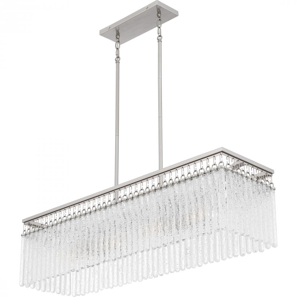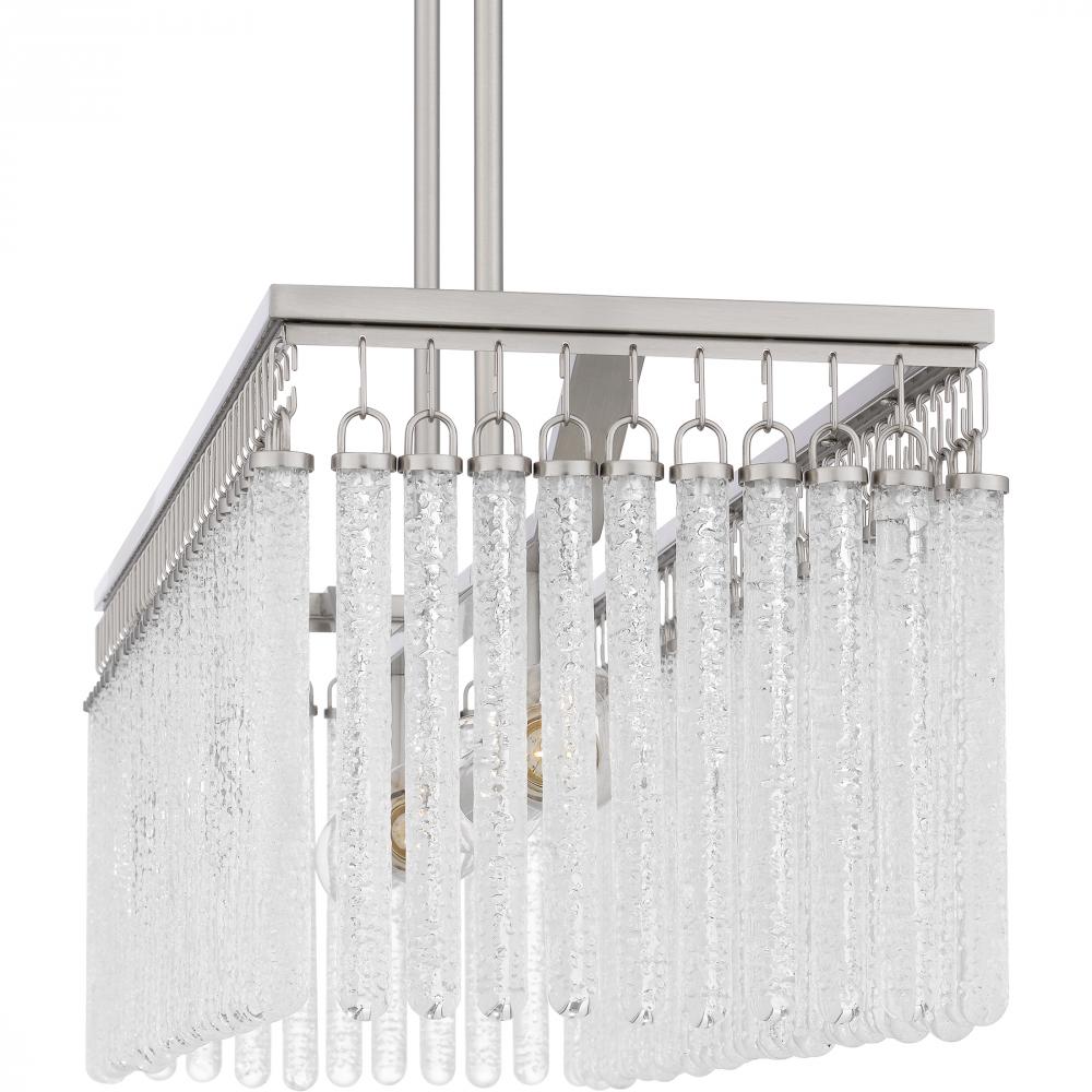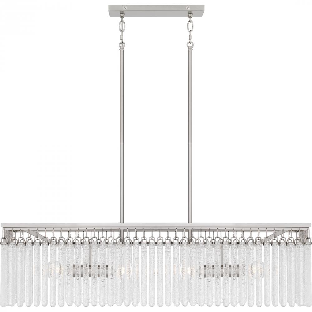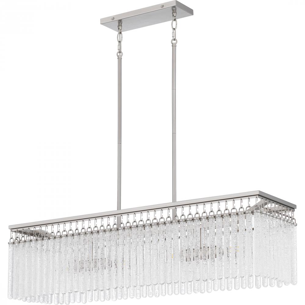 Make a beautiful statement with the Camilla linear chandelier. Clear crystal glass columns hang delicately from the elongated frame, creating a sense of luxury and airiness. Finished in a timeless brushed nickel, this glamorous island light is a timeless c