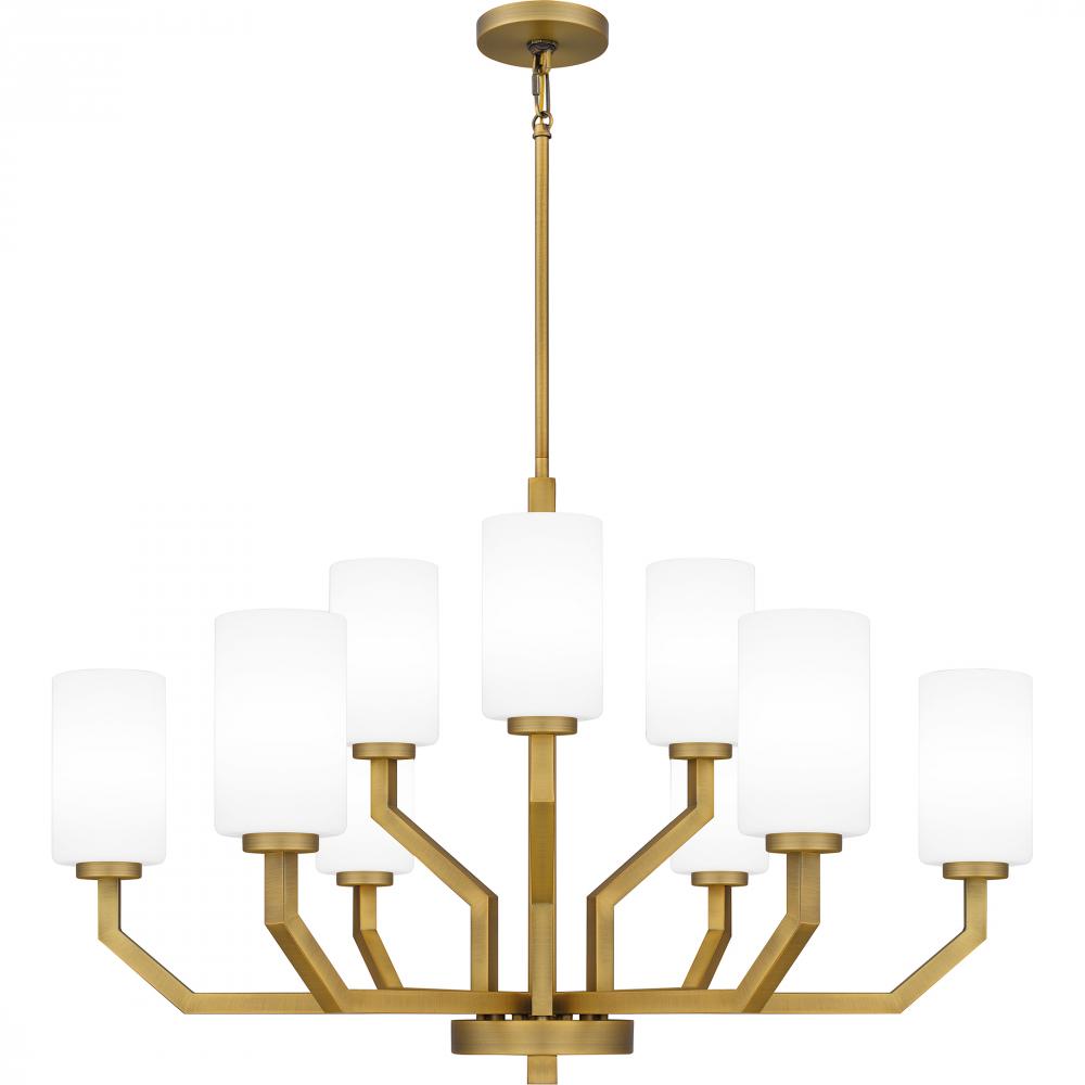 Modern art meets functional lighting in Cavalier. Soft opal glass shades rest atop sculptural, slightly bending arms for a geometric yet sophisticated feel. The aged brass finish adds a beautiful luster, making the Cavalier chandelier a perfect statement p