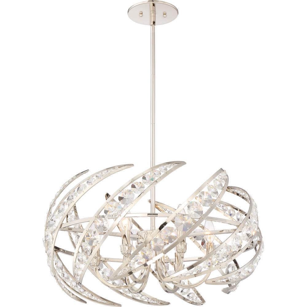 With a luminous design and striking style, the Crescent pendant is an impressive addition to Quoizel’s Platinum Collection. The half-moon bands that encompass the base are open and feature glittering crystal accents. The Polished Nickel finish is the p