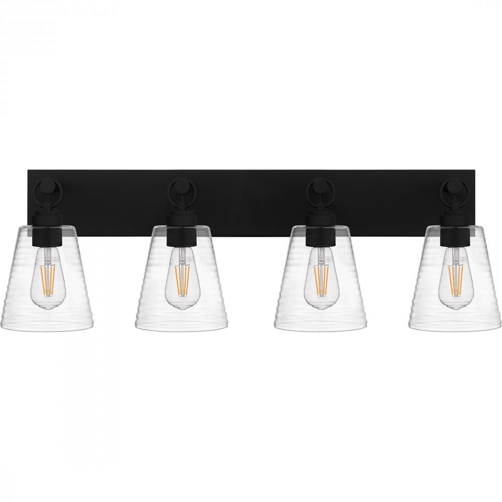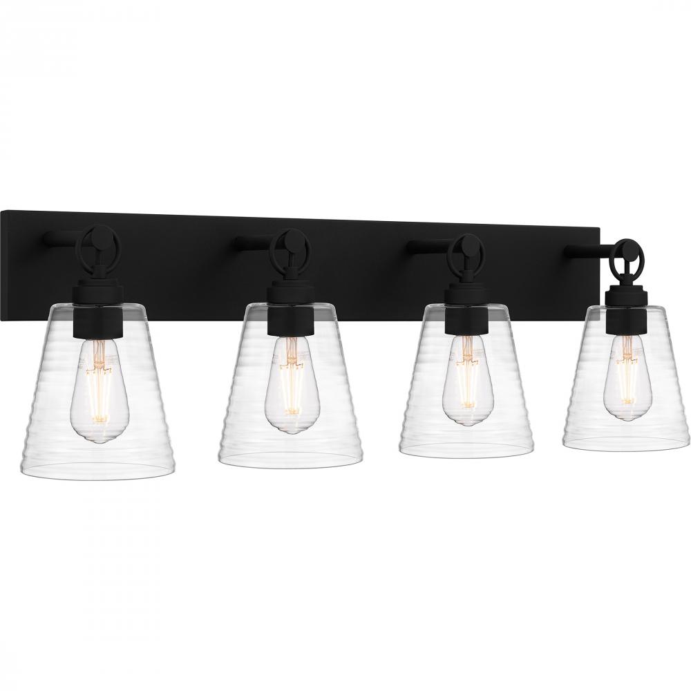 Clear swirl glass shades add major visual intrigue in the Dacosta wall sconce and bath light collection. A delicate hook accent connects the glass shades to the minimalist backplate, offering subtle farmhouse style. Finished in earth black, Dacosta makes a