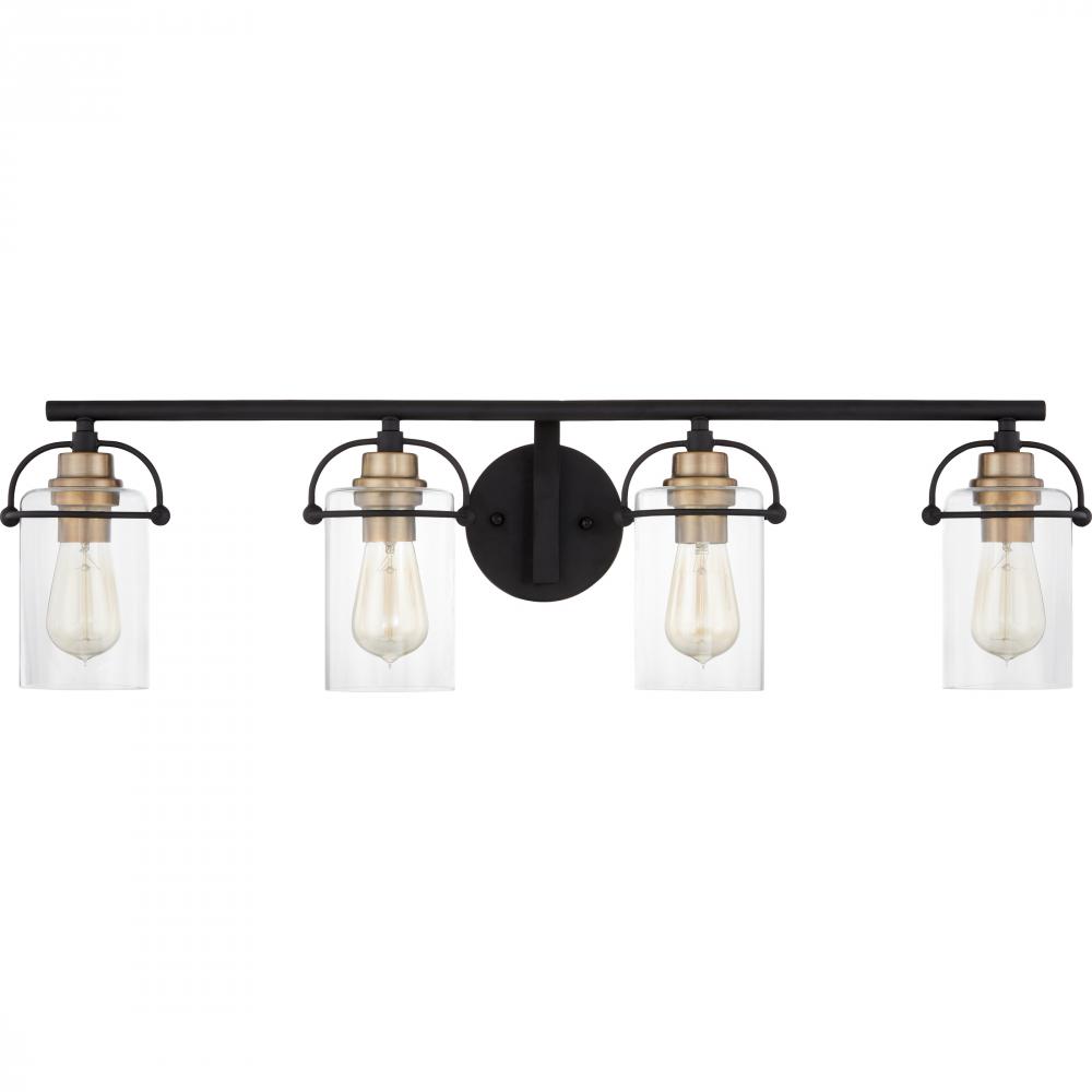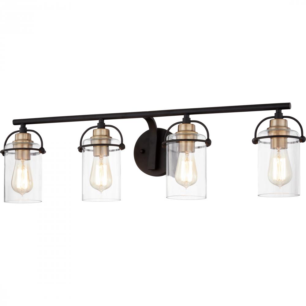 Emersons transitional silhouette charms with unique harness-style brackets and simple clear glass shades. These bath vanity lights are available in multiple sizes and either a Brushed Nickel or a Matte Black finish. The Brushed Nickel finish boasts a class