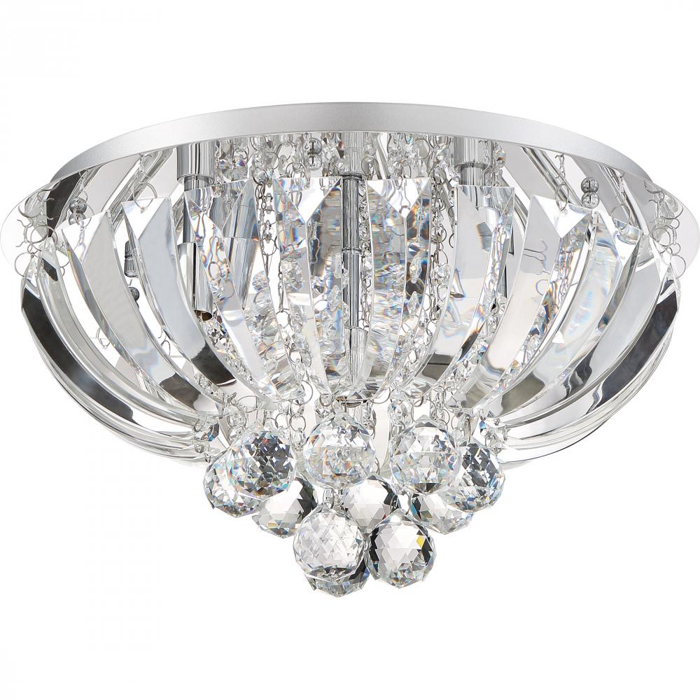 Treat your space to a dazzling display of light and glass with the Glisten flush mount, another beautiful addition to Quoizels Platinum collection. Slices of curvy beveled glass surround a cluster of brilliant crystal strands, which intersect in a stunning