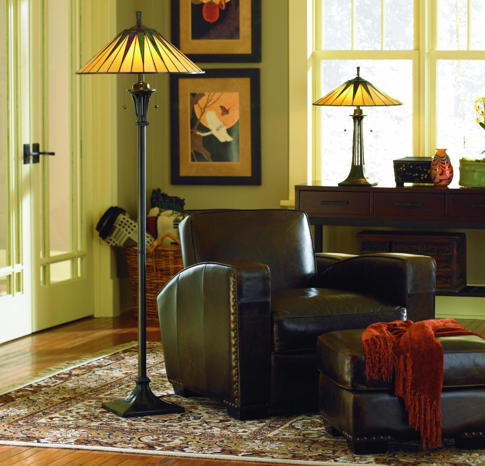 This distinctive style is a great way to bring the drama of Tiffany glass into a contemporary or modern room setting. The hand cut iridescent art glass is arranged to form a slender triangle pattern in shades of rich ebony and warm yellow. Simply stunni