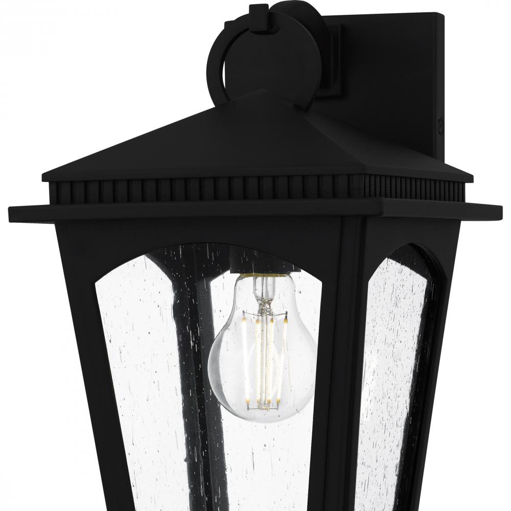 The Huck outdoor lantern collection offers a traditional design with a twist, perfect for sleek exteriors. The tapered frame is finished in a sophisticated earth black finish and features unique ribbed detailing along the top that adds visual interest. Cle