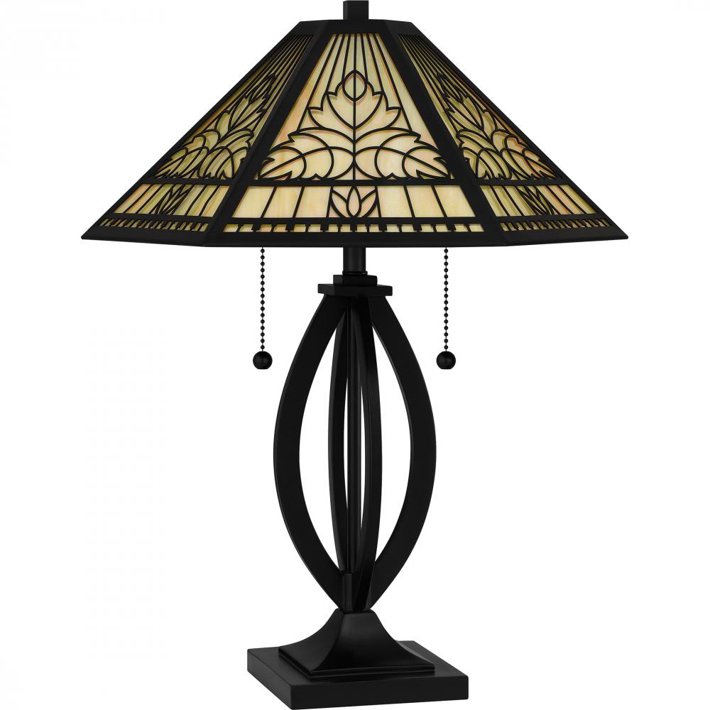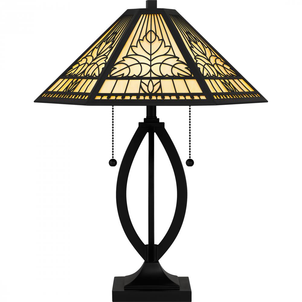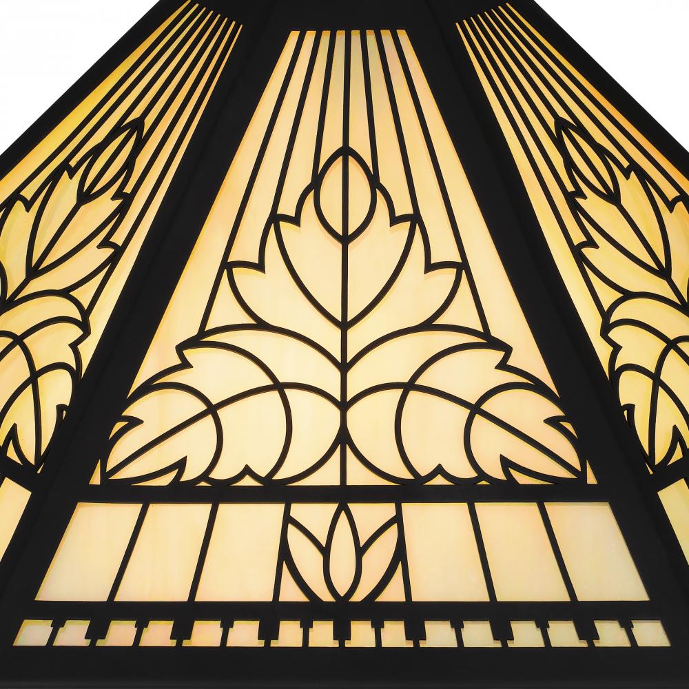 With its bold pattern and classic Arts and Crafts design, the James table lamp delivers on refined masculine style. The handcrafted Tiffany glass shade pairs a warm honey amber background with a geometric leaf design. A matte black finish adds beautiful co