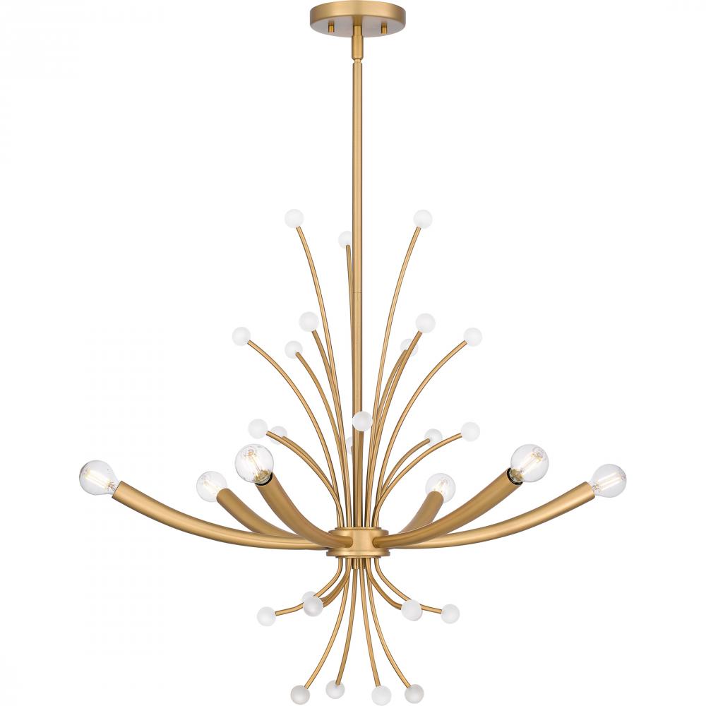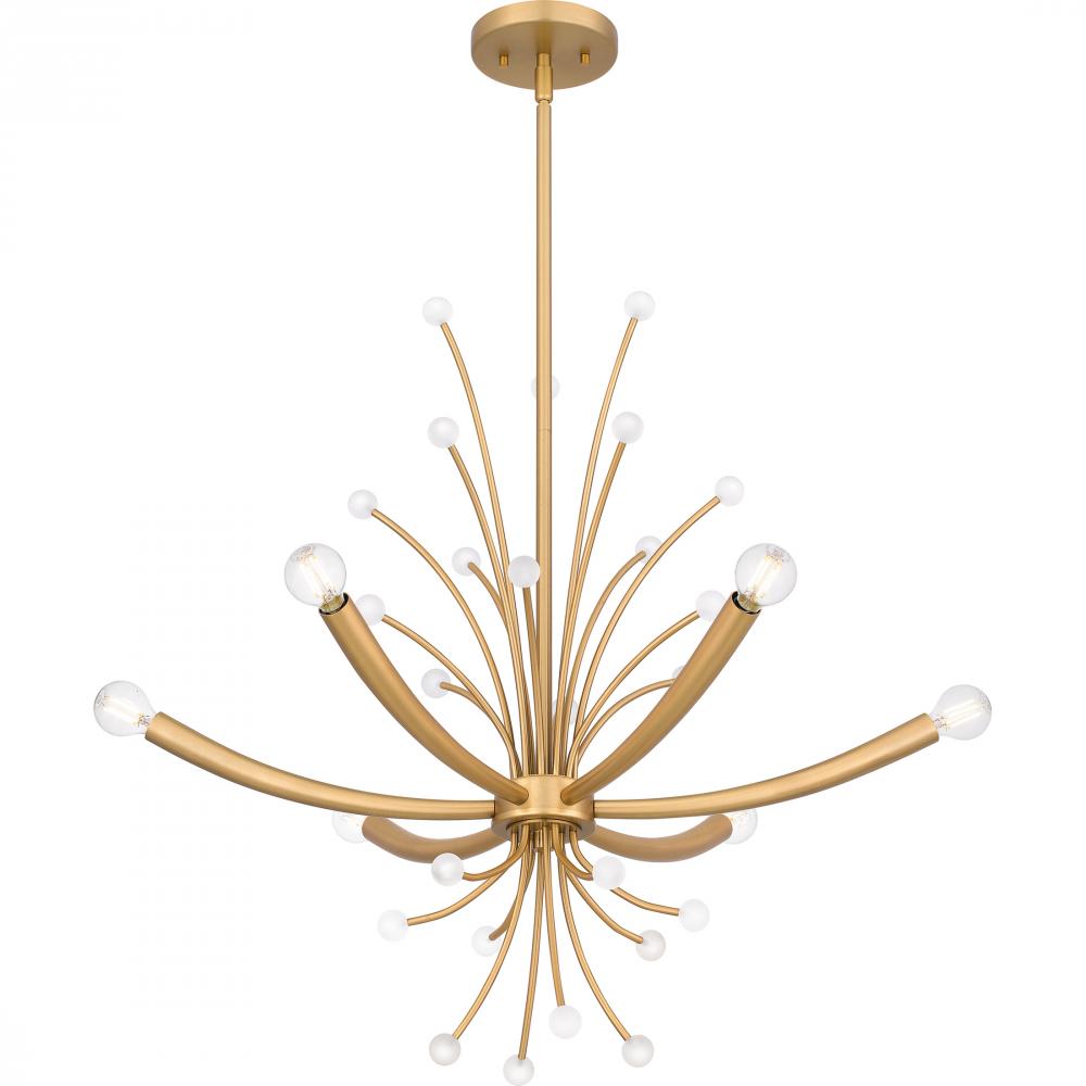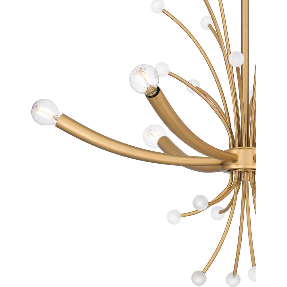 Kiera radiates on-trend, modern style. The captivating chandelier features a futuristic design with sleek, curving lines and small white spherical accents. Kiera is available in two beautiful finishes - choose brushed weathered brass for a slightly retro v