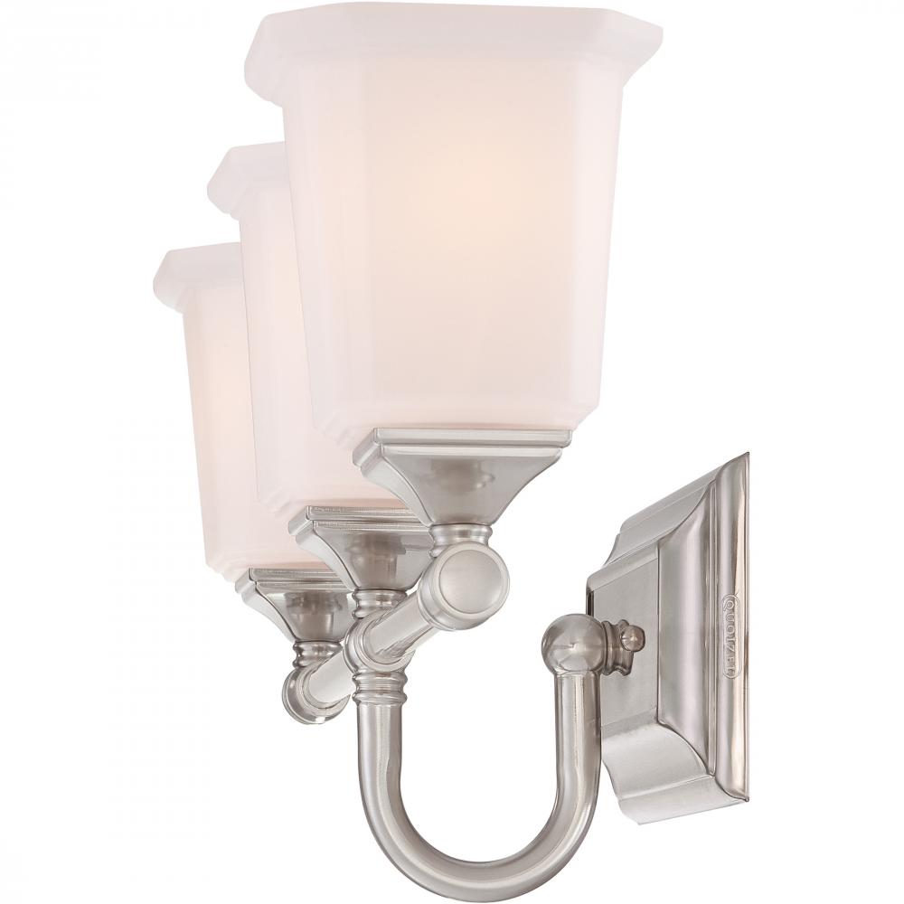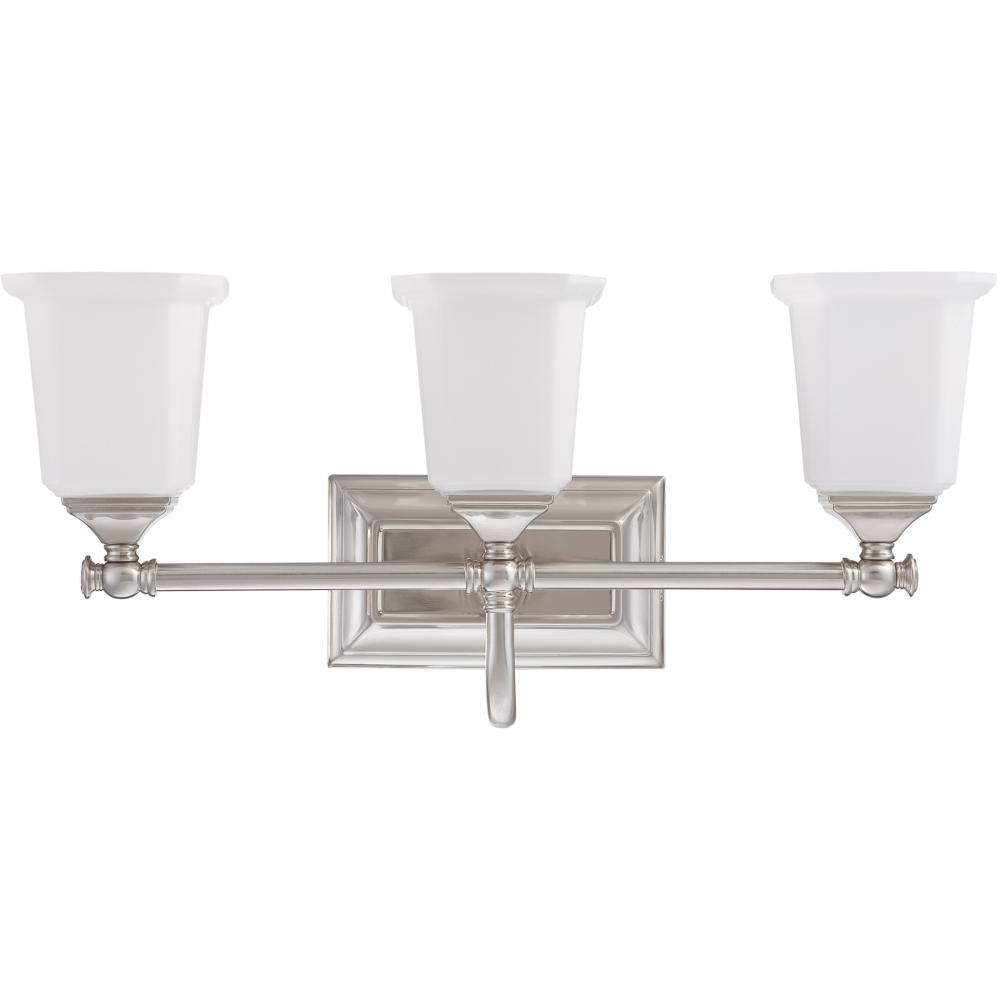 This gleaming collection gives a solid nod to mid century style. The squared shape of the opal etched glass shades gives this design an edge and it is complemented beautifully by the rectangular backplate.