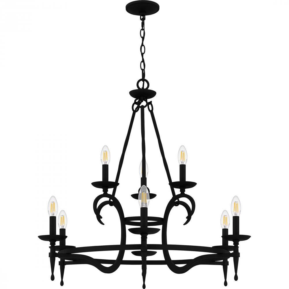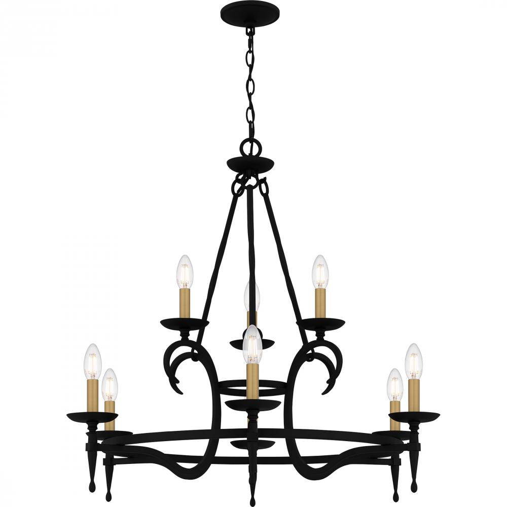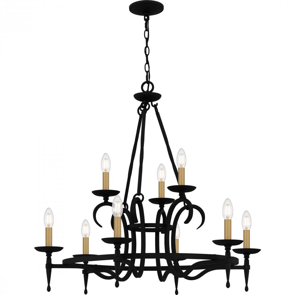 Elegant scrollwork and aged brass accents make Octavia a standout in any room. The earth black silhouette features delicately curving arms and aged brass candle sleeves for a pop of shimmering gold. Octavia is available as a chandelier or wall sconce, and