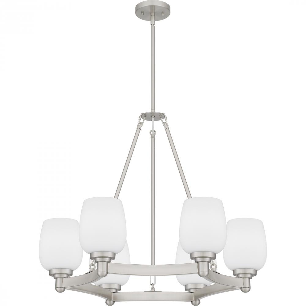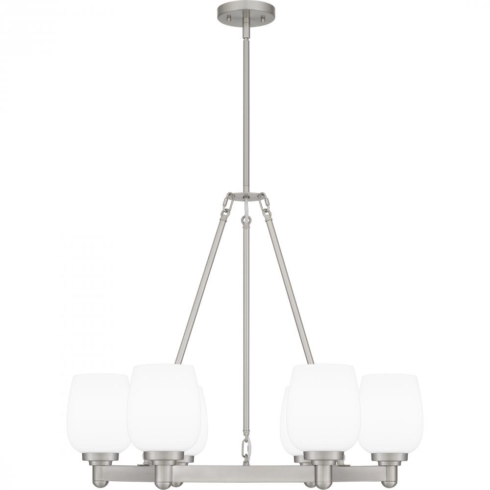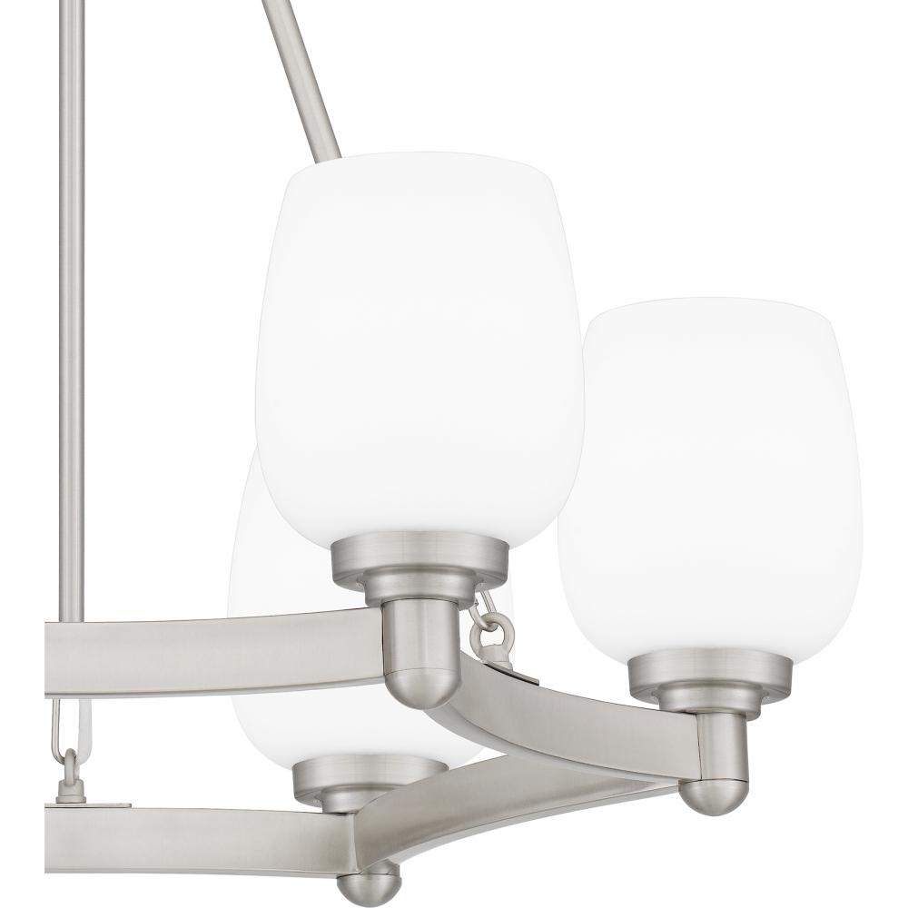 A fresh interpretation of the classic wagon wheel silhouette, Penning features opal etched glass shades that softly cast light. Whether in brushed nickel or matte black, the Penning chandelier delivers on updated traditional style. Hang this chandelier or