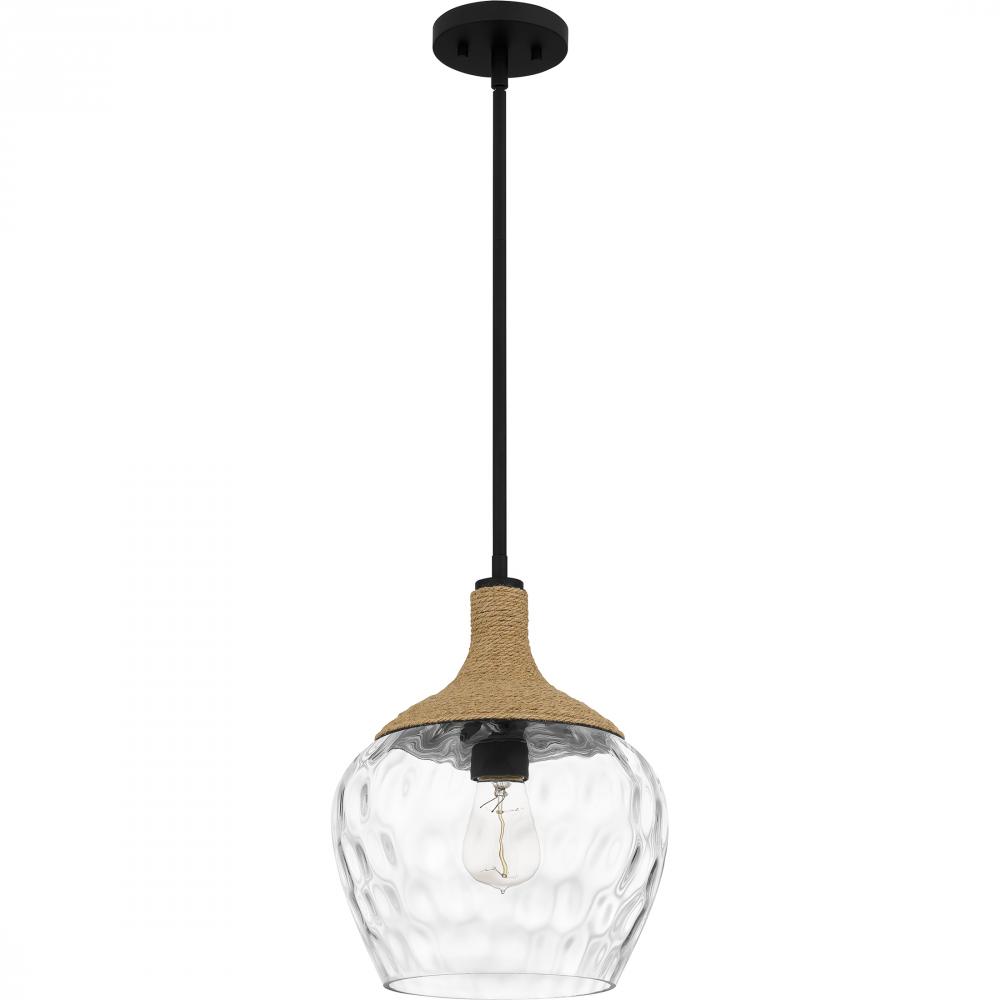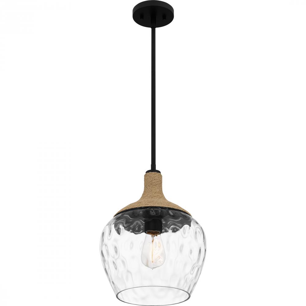 Part of the Quoizel Naturals series, the Royer one-light pendant exemplifies modern bohemian style. Rope detailing surrounding the top of the glass globe shade calls to mind coastal elements. Choose from either clear water glass or opal etched glass – bo