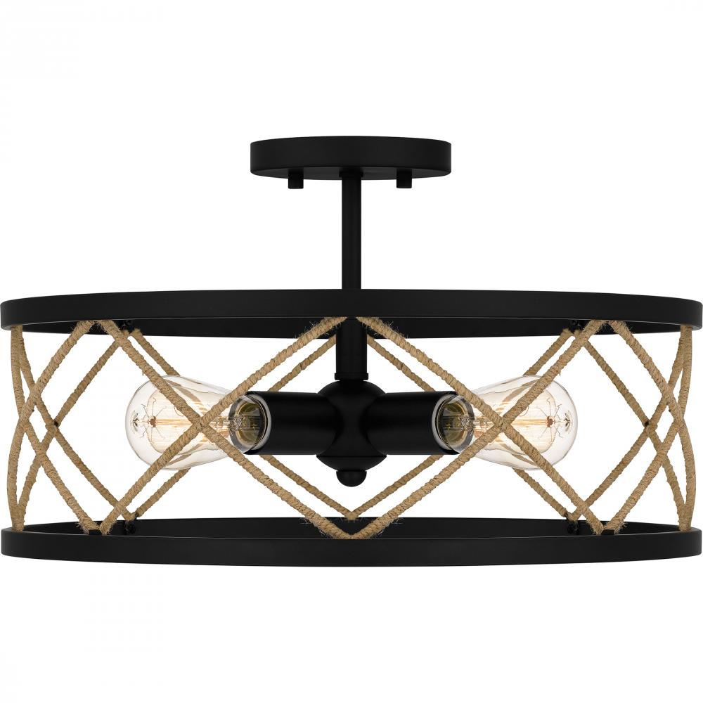 Cedar Park embraces elements of both industrial and coastal design. Part of the Quoizel Naturals line, this semi-flush mount light features an elegant lattice pattern made of rope instead of the typical metal lines. A matte black finish completes the look