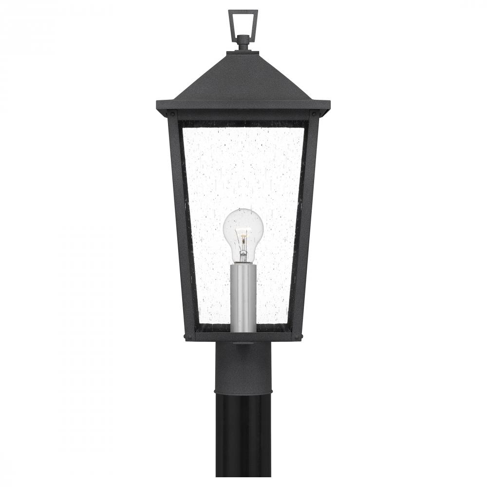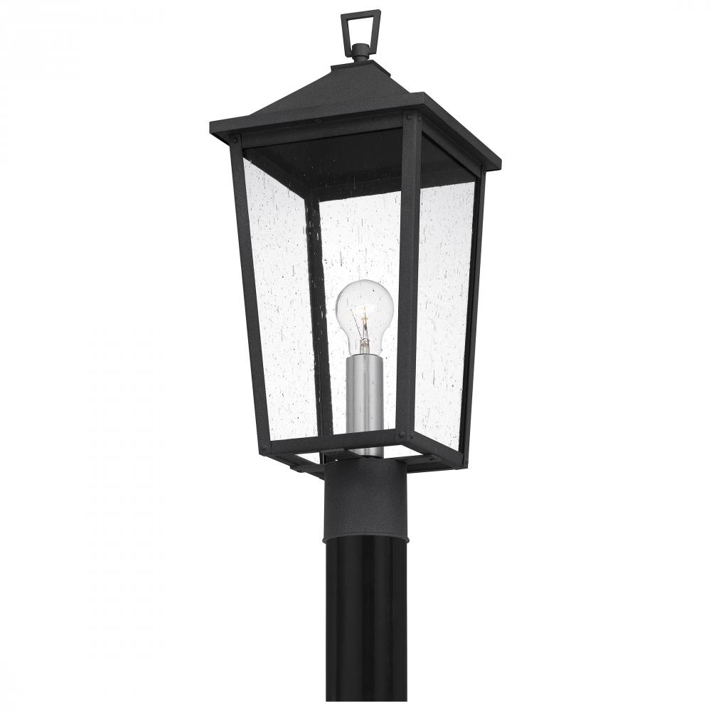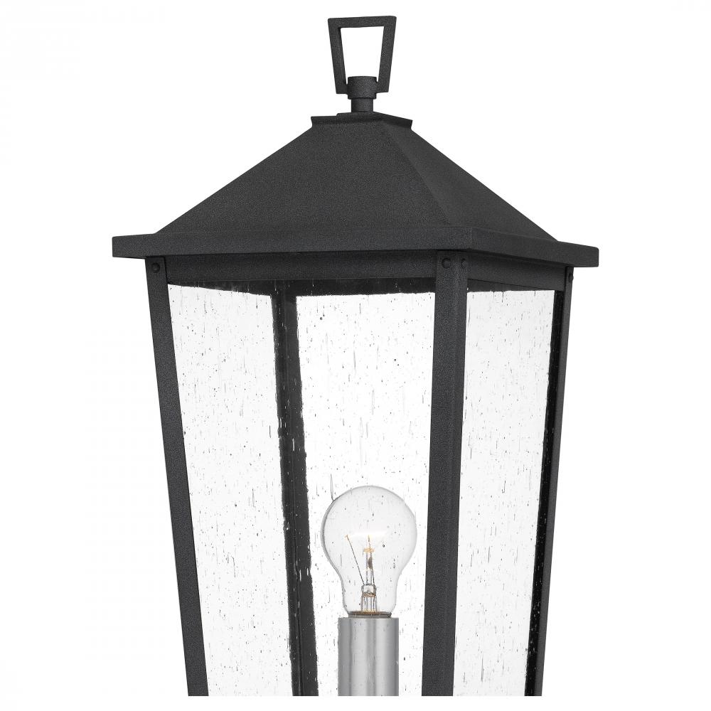 Clear seeded glass gives Stoneleigh a touch of whimsy. In a mottled black finish, this pendant design is otherwise stately and handsome. Suspend it within a portico to welcome guests in refined fashion.