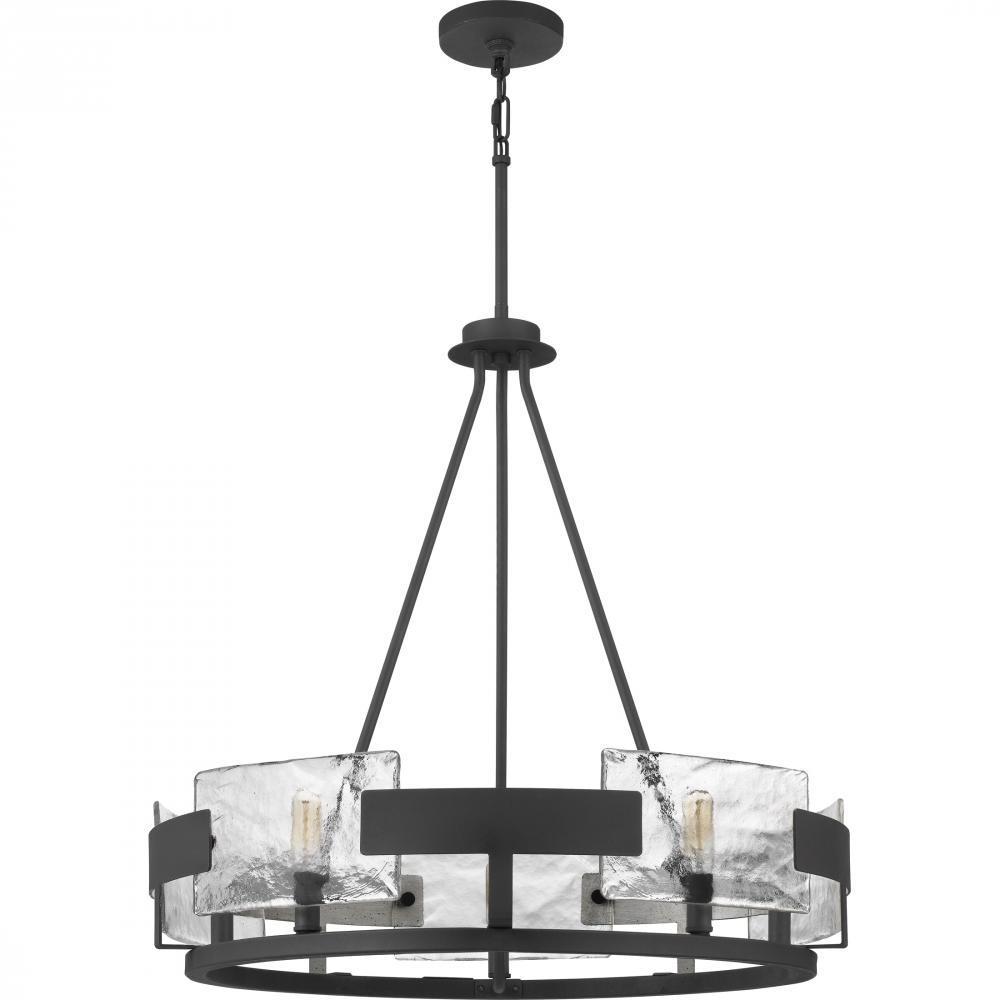 The Stratum delivers drama and depth in volumes. Thick panels of handmade glass subtly conceal the bulb, while allowing the light to pass through. A robust metal ribbon finished in royal ebony completes this artisanal look.