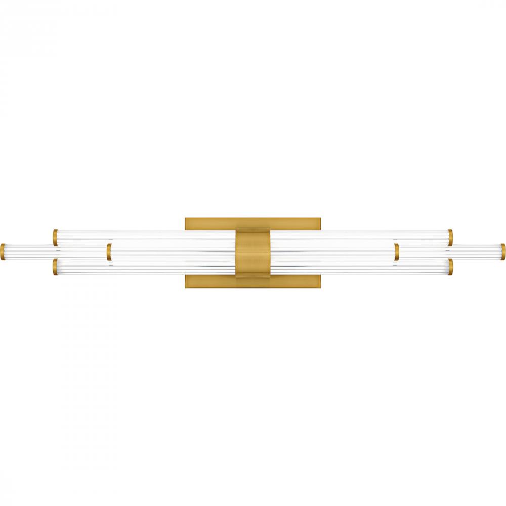 The Talbott bath light features a striking modern design with a sleek, minimalist aesthetic. The rectangular backplate contrasts with the series of parallel cylindrical acrylic rods, creating a unique and eye-catching visual. Each rod houses an integrated