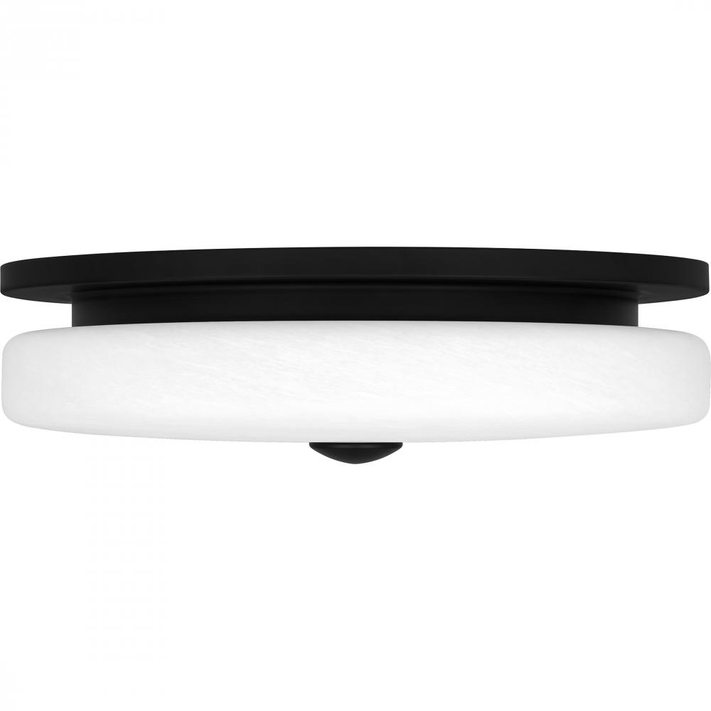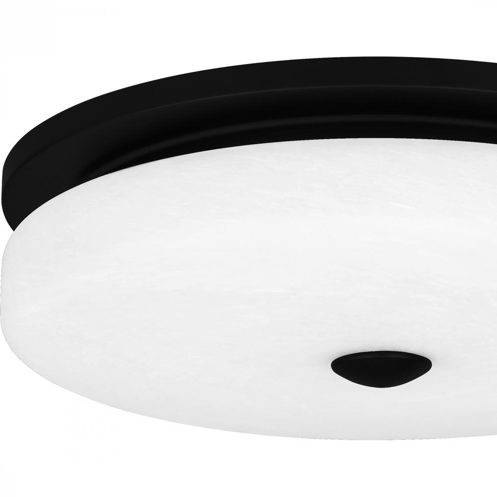 The Tavani flush mount is a sleek, minimalist design that blends flawlessly into both modern and contemporary spaces. The simple, round silhouette features an alabaster glass shade and a contrasting matte black finish. Tavani uses integrated LED technology