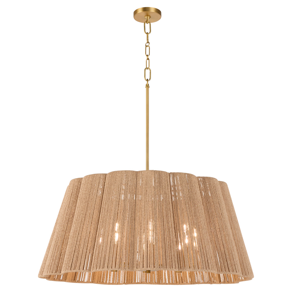 Anton blends natural texture with a modern silhouette, featuring a scalloped drum shade wrapped in natural fiber for a warm, diffused glow. A delicate stem extends from the top of the shade, connecting to a sleek, Figaro chain that enhances its refined appeal. Available in various finishes and sizes.