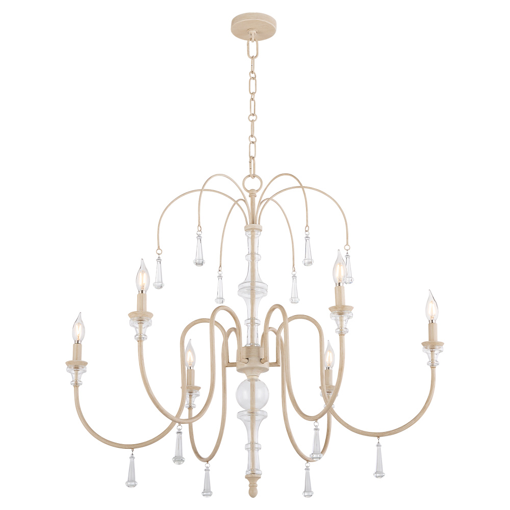 Clasica brings European-inspired elegance to any space with its romantic and traditional design. The washed oak finish works seamlessly with the shaped glass detail. Its soft, weathered tones complement the smooth, sculpted form, creating a delicate and distinguished look. Bold glass crystals hang from the arms, adding a touch of luxurious brilliance that enhances the fixture’s elegant silhouette. Available in multiple light configurations to suit a variety of settings.