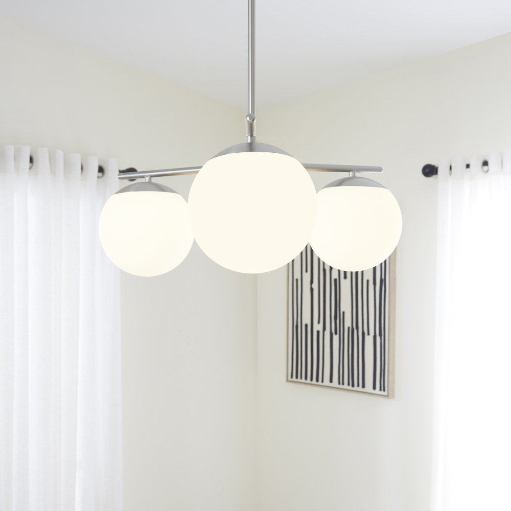 Part of the Main Street collection, the Jasper collection showcases a modern hub-and-spoke design with round globe shades and clean symmetry. Available in matte black or satin nickel and offered in both 3-light and 6-light configurations, it’s designed to suit a range of modern interiors.