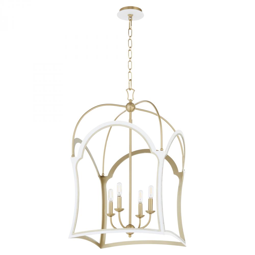 The Tiffany lantern has a distinctive shape, formed by a gracefully curved fluted frame finished in a combination of aged brass and white. The decorative design features four gently arching supports that converge at the top, forming an elegant canopy. Within the open frame, there are four candelabra sockets mounted on aged brass sleeves. The lamps are exposed, providing ample light and contributing to the chandelier’s transitional aesthetic. This inspired design is airy and intricate, adding a posh touch without overwhelming a space.