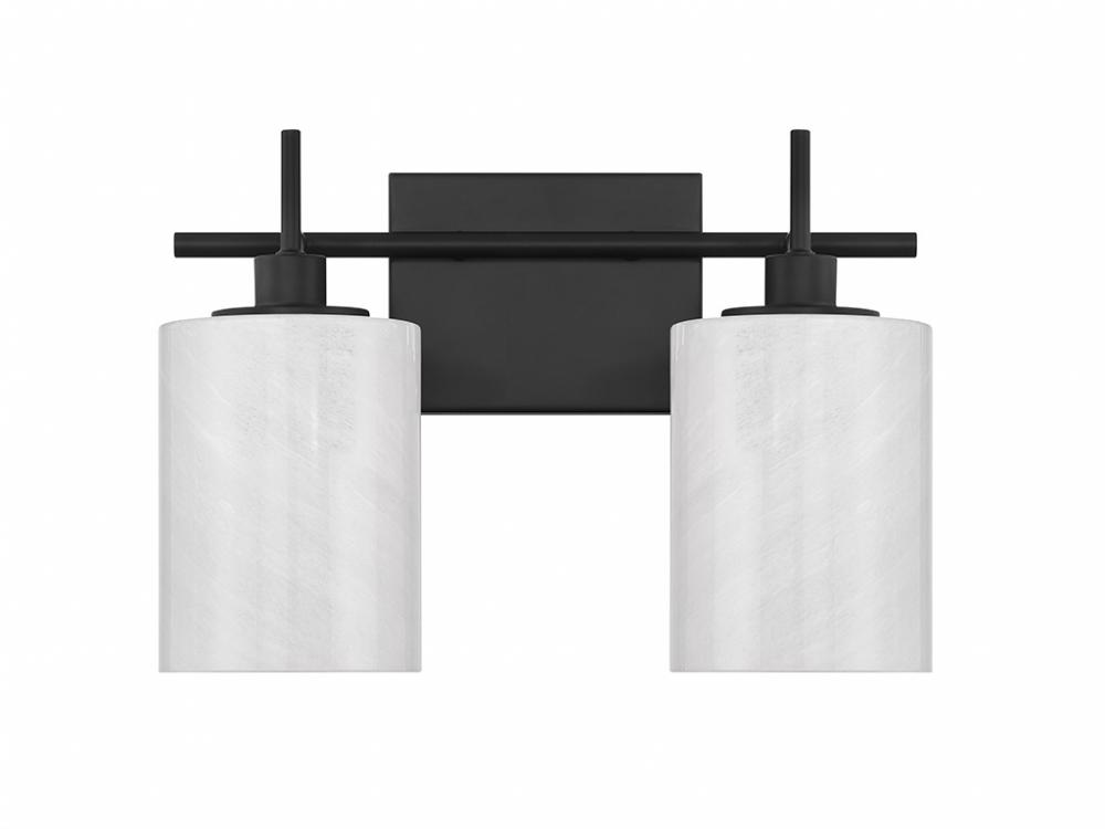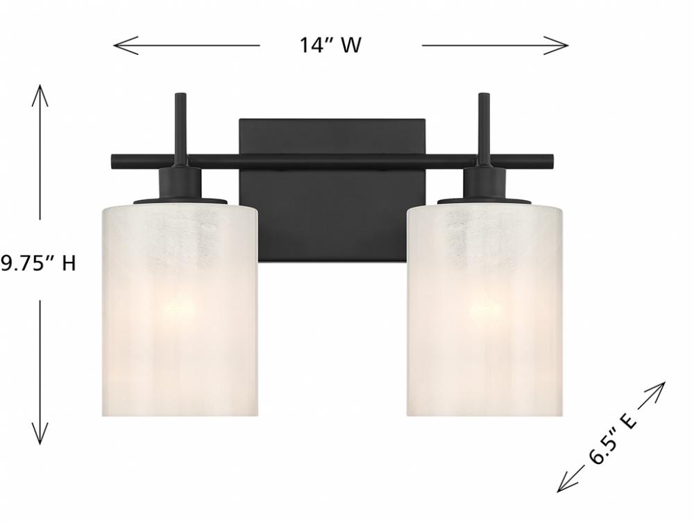 Brighten up your bath easily and beautifully with this 2-light bath bar, which showcases shades of strie glass featuring dazzling swirls that draw the eye, soften the glow and work beautifully with the Matte Black finish. It is 9.75" in height, 14" in width and extends 6.5" from the wall. Uses two standard size bulbs of up to 60 watts per bulb. Bulbs not included.
