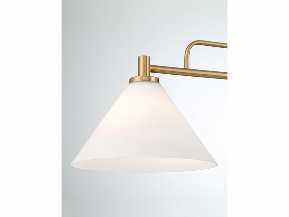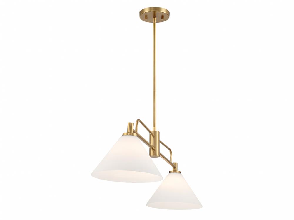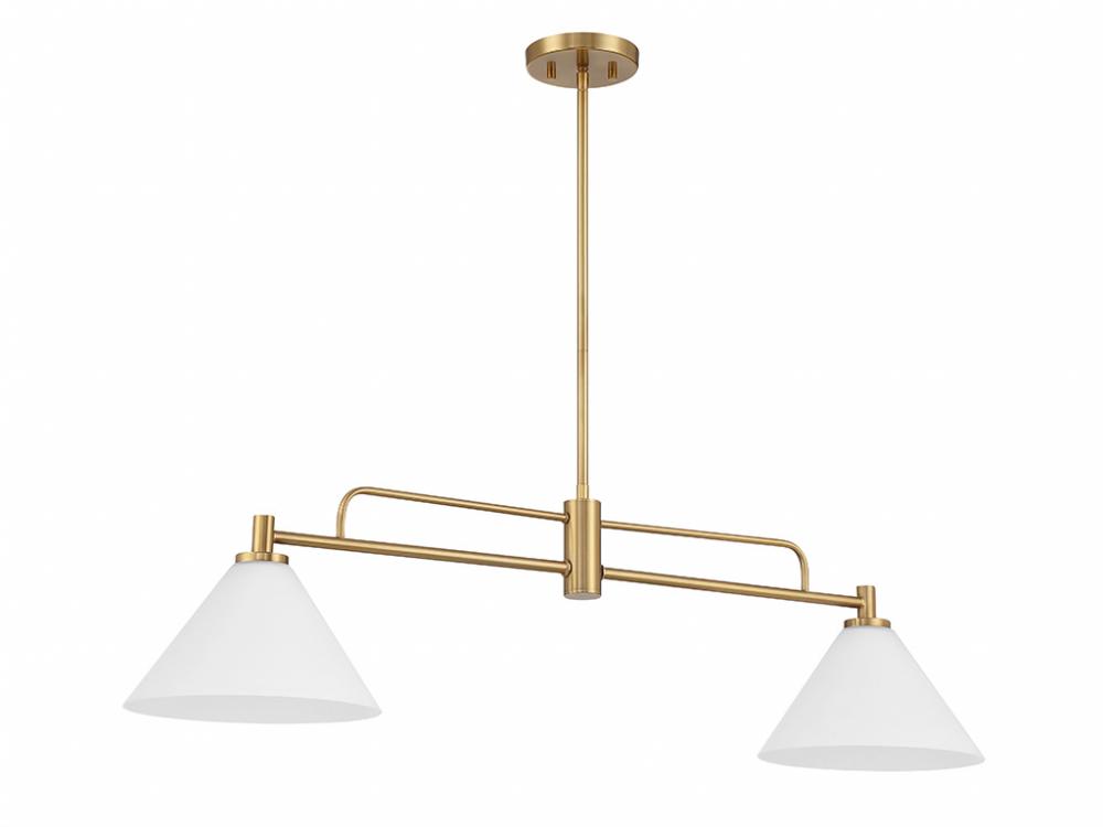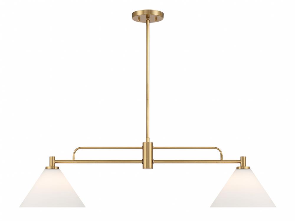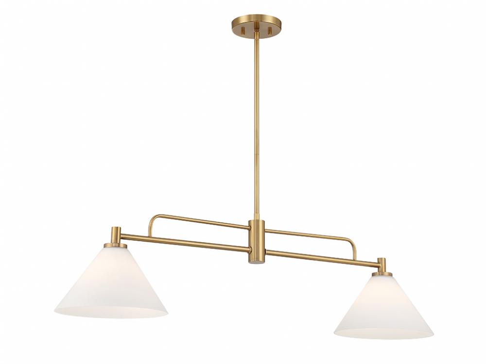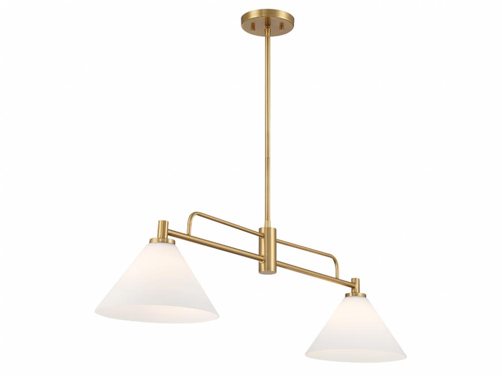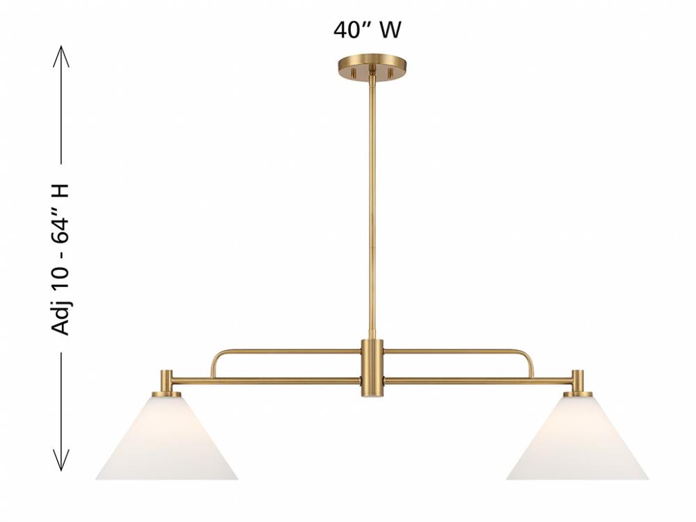 This crisp and elegant 2-light island pendant is a perfect way to illuminate a kitchen island, a long dining table, a billiards room or any other stylish space. Conical shades of opal white glass provide bright, smooth light. Understated detailing, finished in Natural Brass, adds a thoughtful touch. Adjustable height ranges from 10" to 64". Comes with eight 12" downrods and two 6" downrods. 40" in width. Uses 2 standard size bulbs of up to 60 watts per bulb. Bulbs not included.