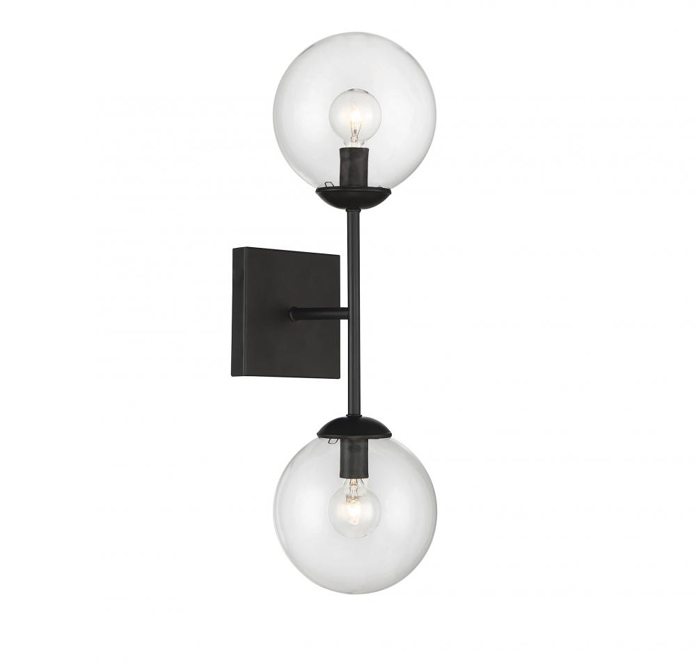 This slim and stylish 2-light sconce is an excellent choice for bold and helpful lighting in any space. Finished in Black with orb-shaped shades of clear glass. 20" in height and 6" in width.
