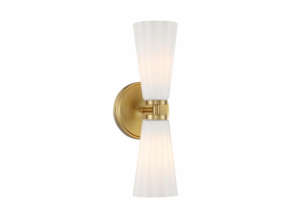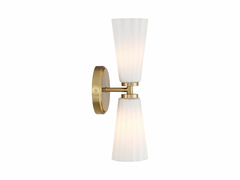 Timelessly beautiful and elegant, this 2-light sconce is sure to brighten your home in style. Its alluring white fluted glass shades add a thoughtful touch of texture and pair nicely with the Natural Brass finish. The height is 14.5", the width is 5.125" and it extends 5.5" from the wall. Uses 2 candelabra size bulbs of up to 60 watts per bulb. Bulbs not included.