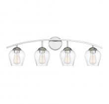 Shape up your bath lighting style with this 4-light bathroom vanity light! Between the curving arm, the wineglass-style clear glass shades and the circular backplate, it’s the perfect way to brighten your bath. Natural brass finish. Can be mounted with shades facing up or down. It is 10.38" in height and 32.75" in width. It extends 7.13" from the wall. It uses 4 standard size bulbs of up to 60 watts per bulb, is LED compatible and is dimmable.