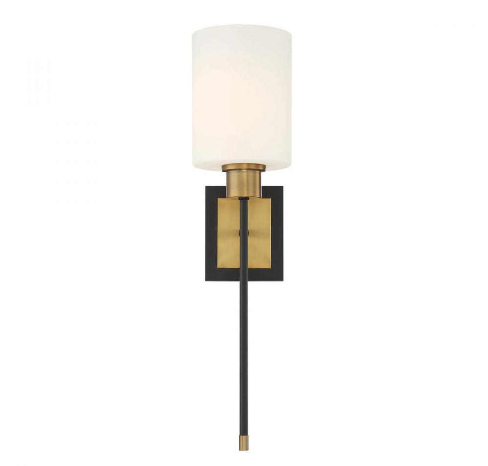 Bring a touch of midcentury modern inspired class to any room with this Savoy House Alvara 1-light sconce. A cylindrical shade of white opal glass is offset beautifully by a long, slender stem finished in matte black with warm brass accents. The square backplate also features the pairing of matte black and brass. Alvara is 22.5" in height and 5.5" in width. It extends 7.5" from the wall. Uses one standard size bulb of up to 60 watts. Damp area rated.