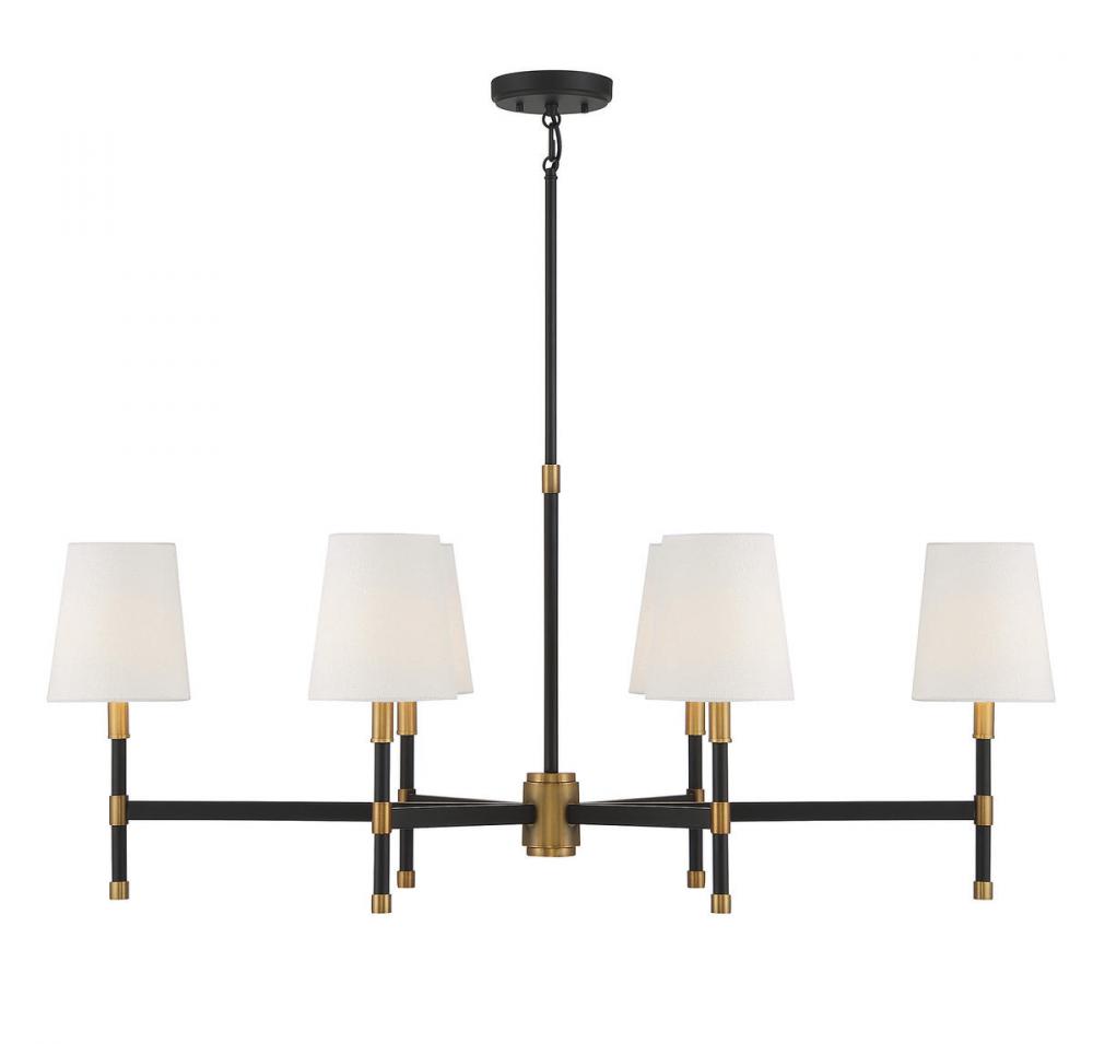 The Savoy House Brody 6-light linear chandelier is a great way to infuse your home with sophisticated lighting style. Its streamlined classic look is decorated with white fabric shades and finished in matte black with bold warm brass accents. It's perfect for brightening up any room! Brody is 41" in length and 18" in width. It has an adjustable height ranging from 24" to 70". It uses six candelabra size bulbs with a max of 60 watts per bulb. Comes with four 12" downrods and one 6" downrod, plus 80" of cord.