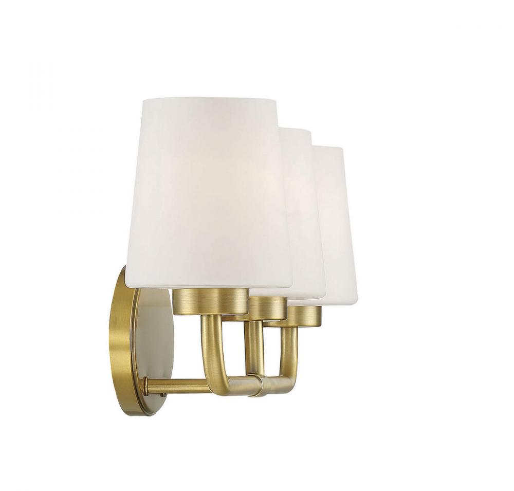 Add chic style to any bathroom with the Savoy House Capra 3-light bath bar. Its substantial structure features classic details along with white opal glassshades that are tapered like lamp shades and open at the top to give off a flattering glow. The large oval-shaped backplate helps to cover up any holes left behind from replacing old bath bars, too. Plus, the hardware for this fixture has been thoughtfully moved to the side of the backplate, allowing for a crisp and clean look. Finished in warm brass. This fixture is 22" wide and 9" tall. It extends 6.5" from the wall.