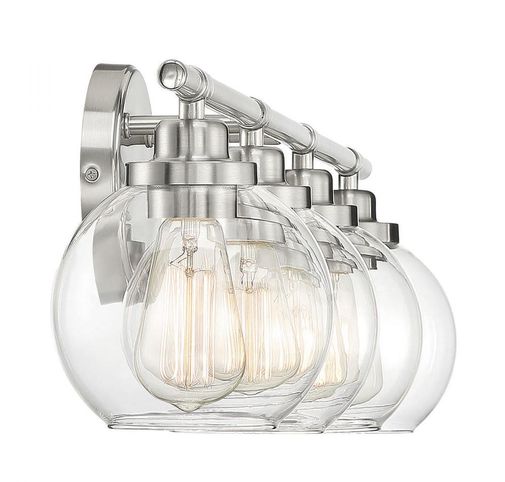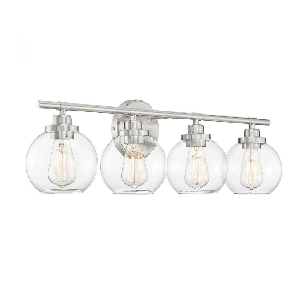 Adding the Savoy House Carson 4-light bath bar easily helps you boost the illumination and the style of any bathroom. Its fishbowl-style clear glass shades make a big statement and are open at the bottom, making it easy to replace the bulbs. The streamlined structure offers up subtle detailing with a mid-century modern vibe and the circular backplate echoes the shape of the glass shades. Finished in satin nickel. This fixture is 30" wide and 8.5" tall. It extends 7" from the wall. Uses 4 standard size bulbs of up to 60 watts each (not included).