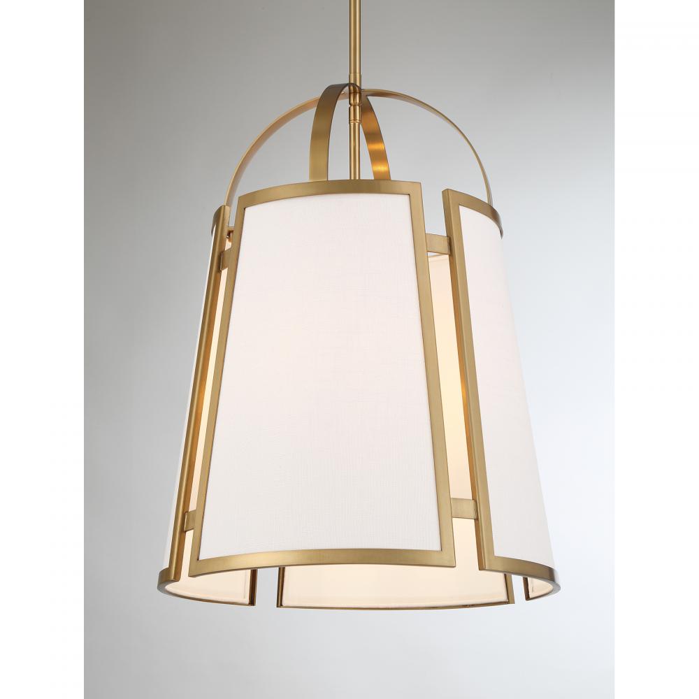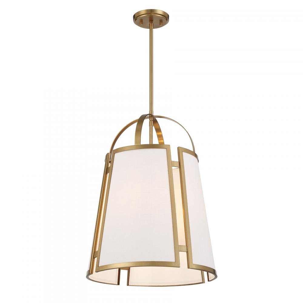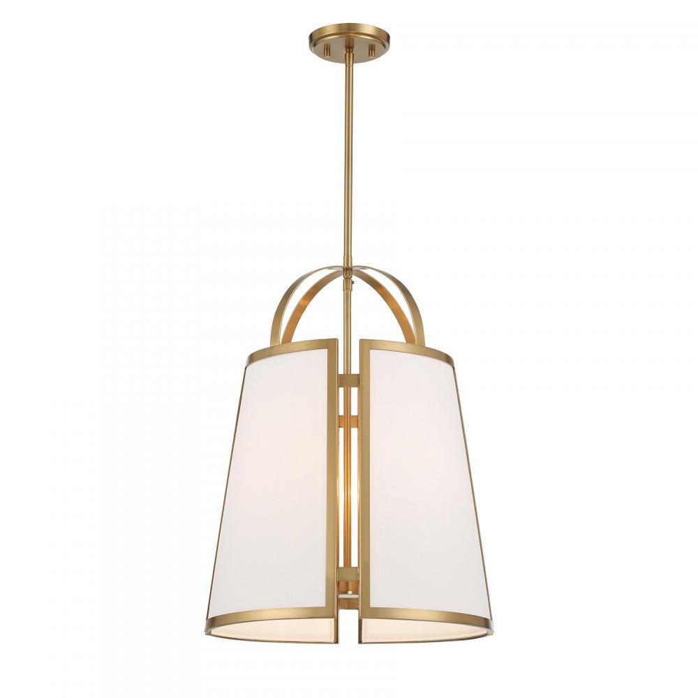 Add a prim and polished look to your home with the Savoy House Chartwell 4-light pendant. The uniquely intriguing shade flaunts cutaway detailing and panes with white linen fabric. Two flat, slim bands help to connect the shade to the downrod. Warm Brass finish. Chartwell is 16.75" in width and has an adjustable height ranging from 22.5" to 76.5". Comes with four 12" downrods and one 6" downrod. Uses four candelabra size bulbs of up to 60 watts per bulb. Bulbs not included.