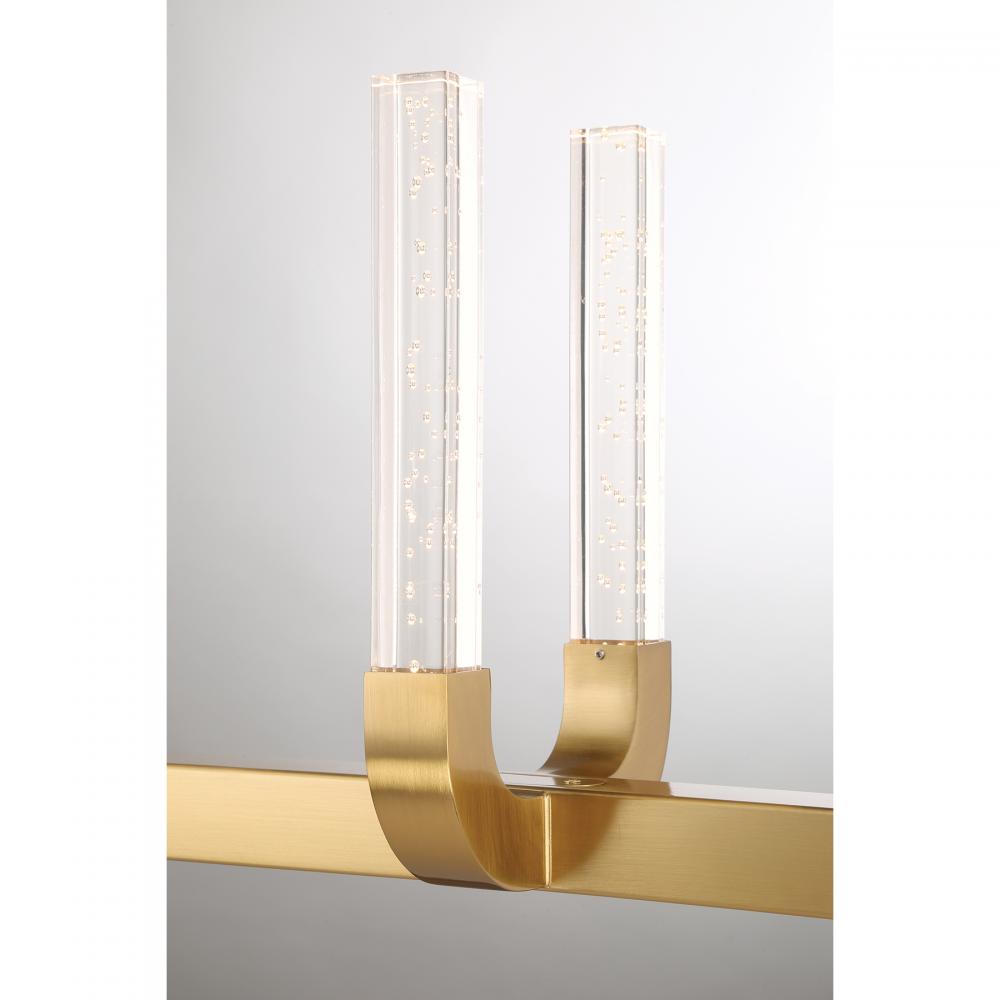 The Savoy House Del Mar 8-light linear chandelier was designed by Breegan Jane, an award-winning interior designer and TV host. Its sleek and slim structure is a stunning example of how Breegan's designs bring the drama without overtaking the room. LED light shines through clear seeded acrylic batons, adding eye-catching texture. Finished in Warm Brass. At 48" in length, 7.5" in width and with an adjustable height ranging from 11" to 55", Del Mar is ideal for illuminating larger spaces. Comes with eight 12" downrods and two 6" downrods.