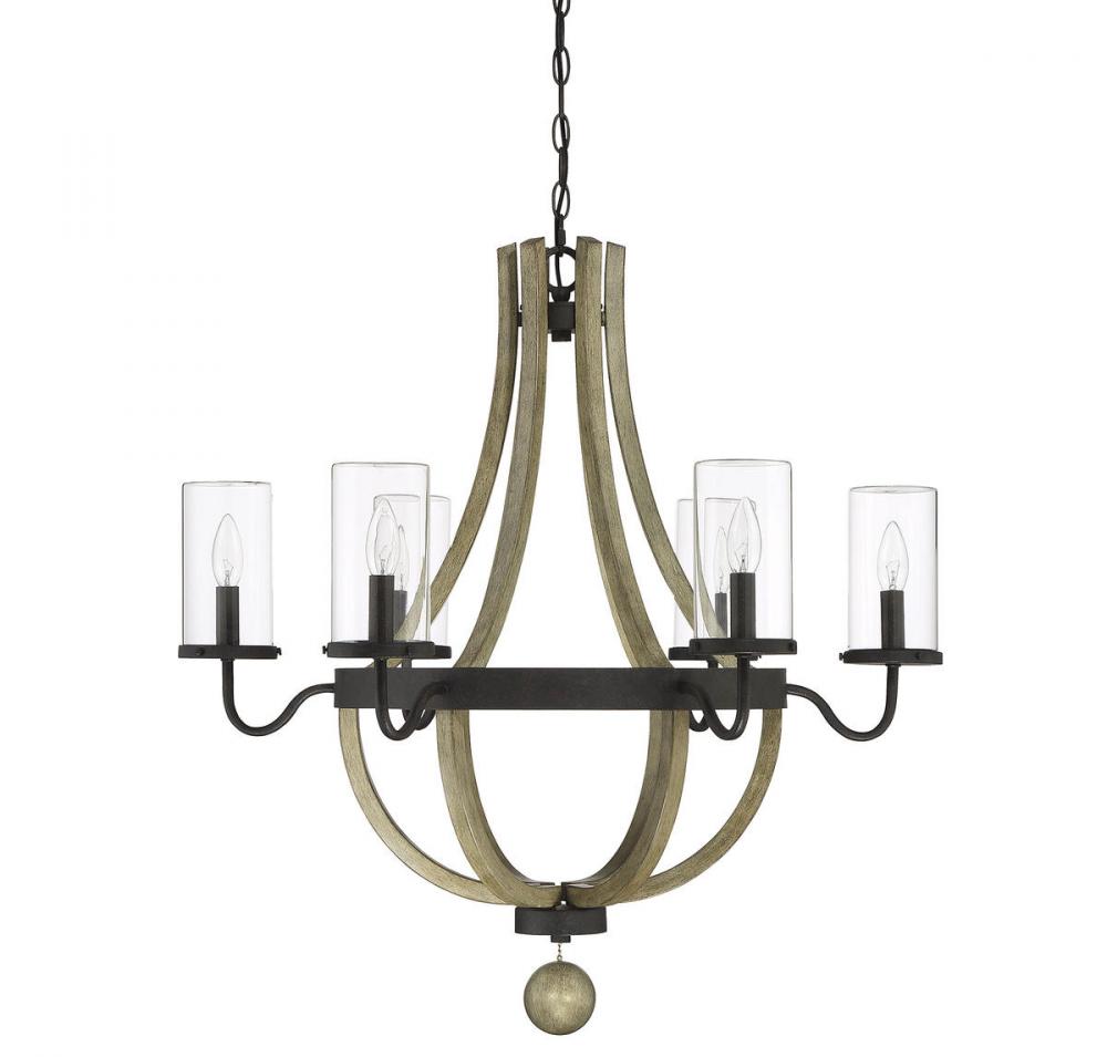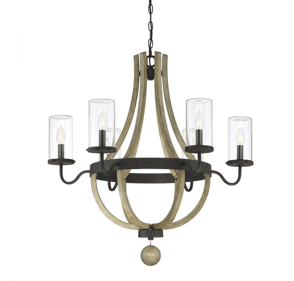 Looking for high end outdoor lighting to help turn a porch or patio into a beautiful exterior living space? The Eden 6-light outdoor chandelier from Savoy House is a great choice. This gorgeous exterior light fixture features a gently curving metal frame coated with a Weathervane finish to give it a wonderfully rustic wood look. A band of dark metal encircles the frame, and six metal candleholders hold candelabra bulbs that shine within clear glass cylinders. A single finial, also finished in Weathervane, completes the simple yet striking design. This damp area rated garden chandelier is built to withstand the elements when enjoyed in a covered area. It’s the ideal outdoor porch lighting for spaces featuring rustic and transitional décors.