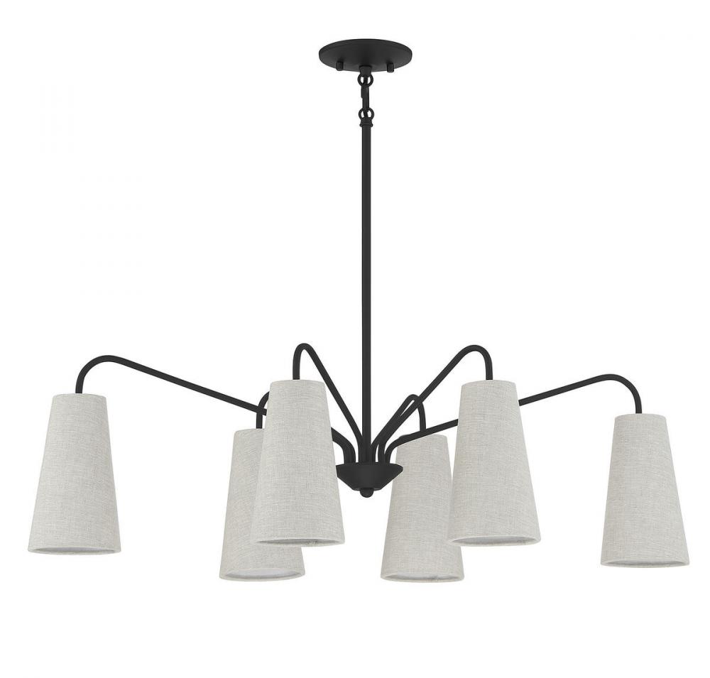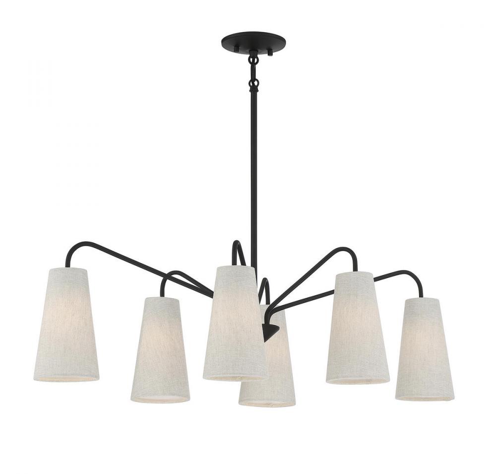 The Savoy House Edgewood 6-light linear chandelier showcases a relaxed, casually stylish look with tall conical shades of oatmeal fabric and a versatile matte black finish. Perfect for brightening up kitchen islands, dining room tables and more. Edgewood is 35" in length and 16.13" in width. It has an adjustable height ranging from 16" to 62". It uses six candelabra size bulbs with a max of 60 watts per bulb. Comes with four 12" downrods and one 6" downrod, plus 80" of cord.