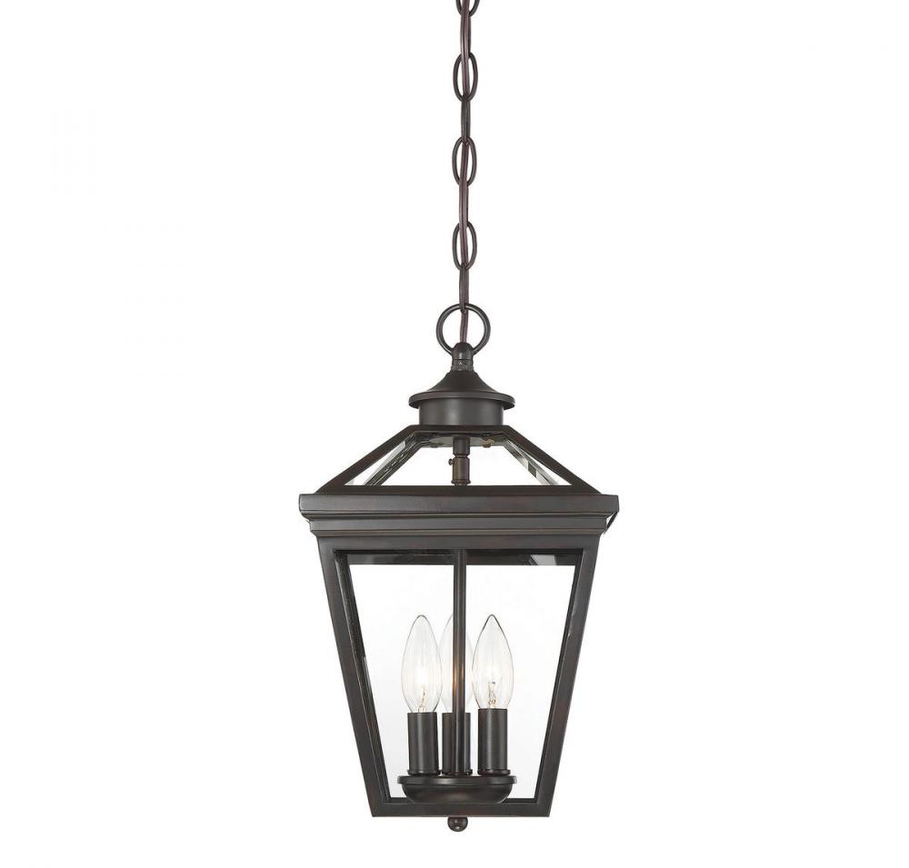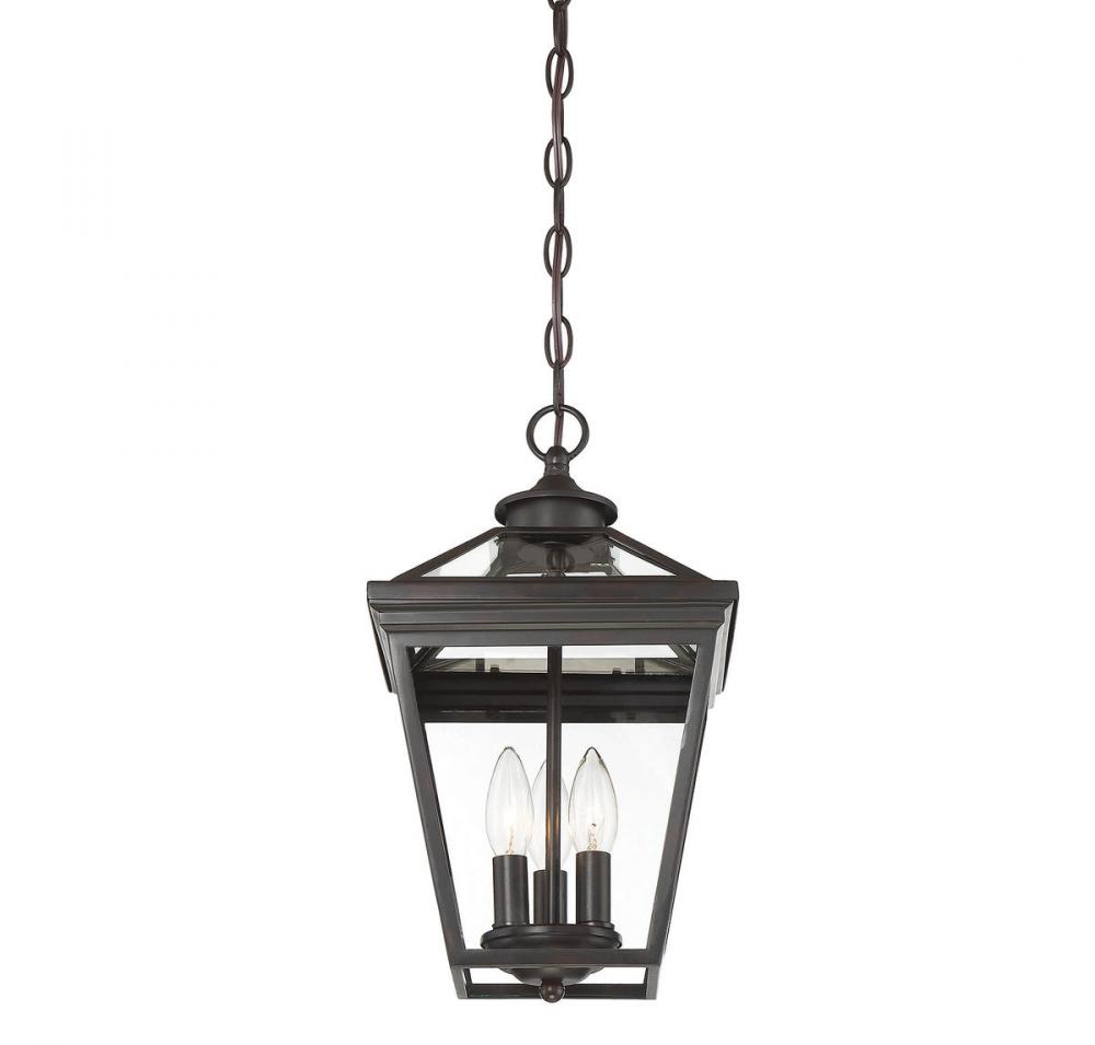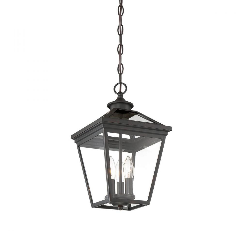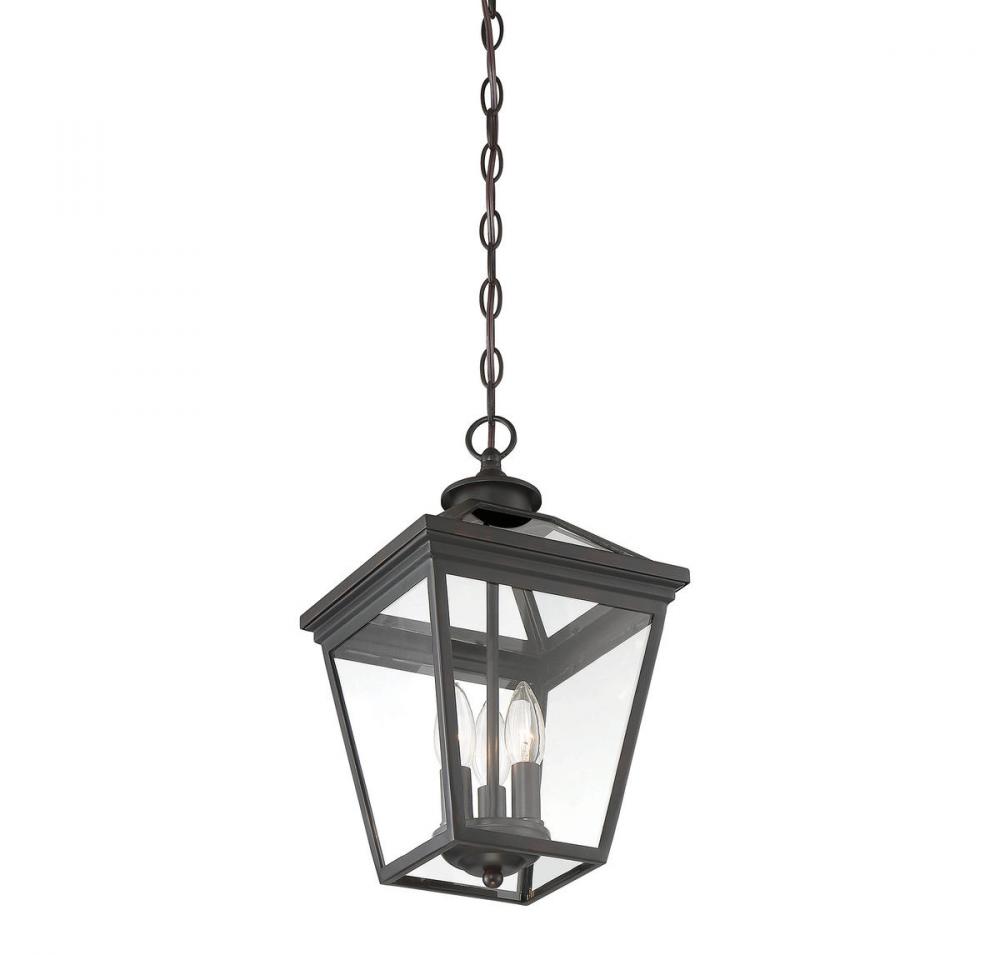 Brighten the exterior of your home and welcome your guests in style with the Savoy House Ellijay 3-light outdoor hanging lantern. The design mimics a vintage gas lantern with a classic tapered box shape and decorative top finial. A sumptuous English bronze finish adds traditional flair and blends well with other hardware and architectural materials. Panes of clear glass fill all four side panels and the roof panels, too. Three 40W candelabra size bulbs provide inviting and secure illumination. This lantern measures 9" wide and 15.75" high.