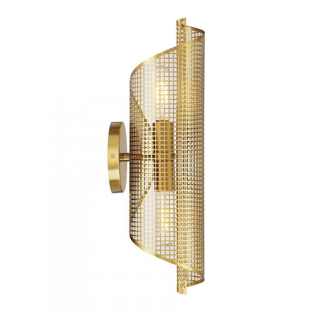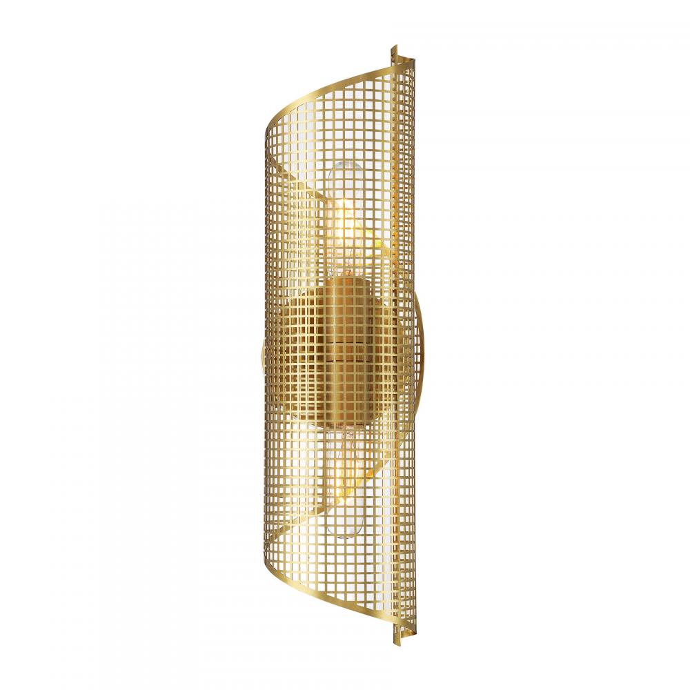 The Savoy House Hillbourne 2-light sconce is a ribbon of intriguing urban loft style. Its perforated metal shade, finished in Warm Brass, appears to swirl and twirl on the wall. Use it alone or in groupings! Hillbourne is 20" in height, 5.5" in width and extends 6.5" from the wall. Uses two standard size bulbs of up to 60 watts per bulb. Bulbs not included. This sconce is damp area rated.
